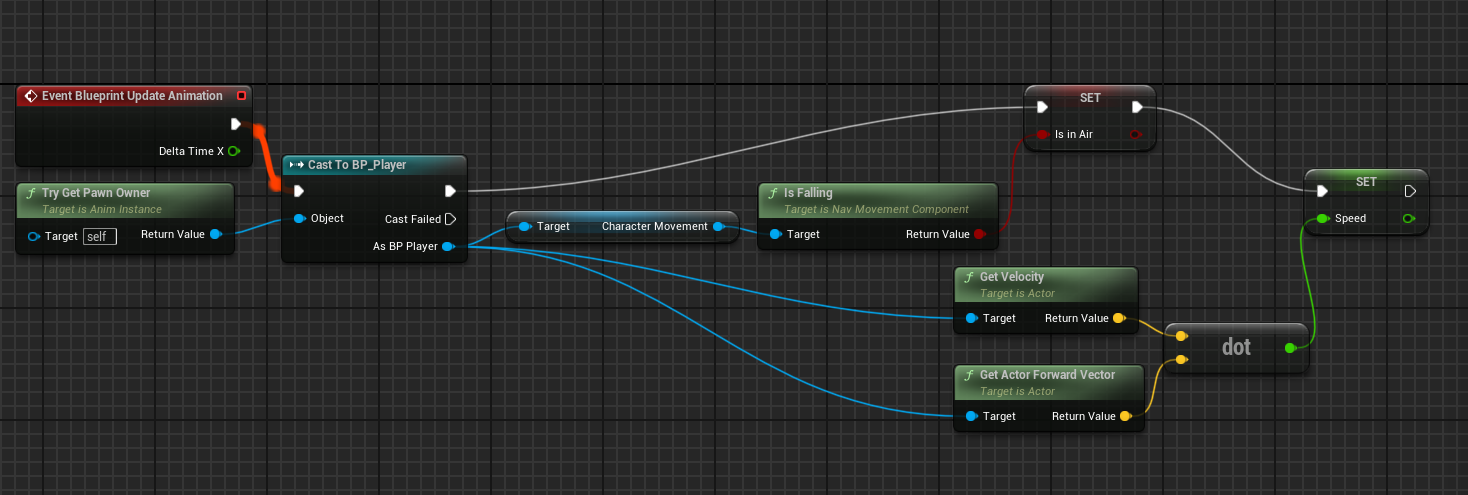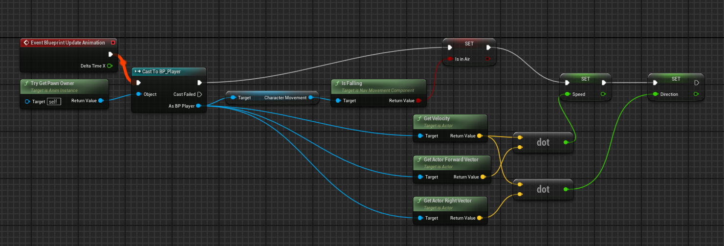 [Get Actor Right Vector] 노드를 생성해서 속도를 받아 내적하여 [Direction]에 Set으로 넣어준다.