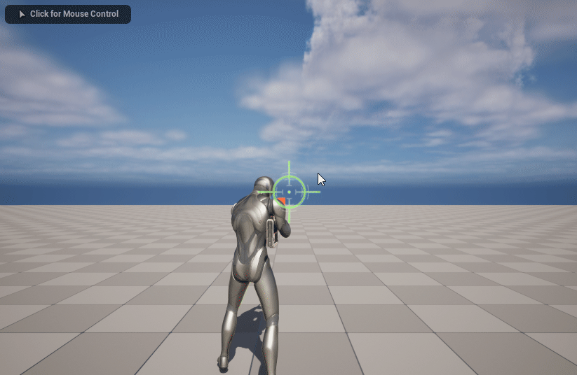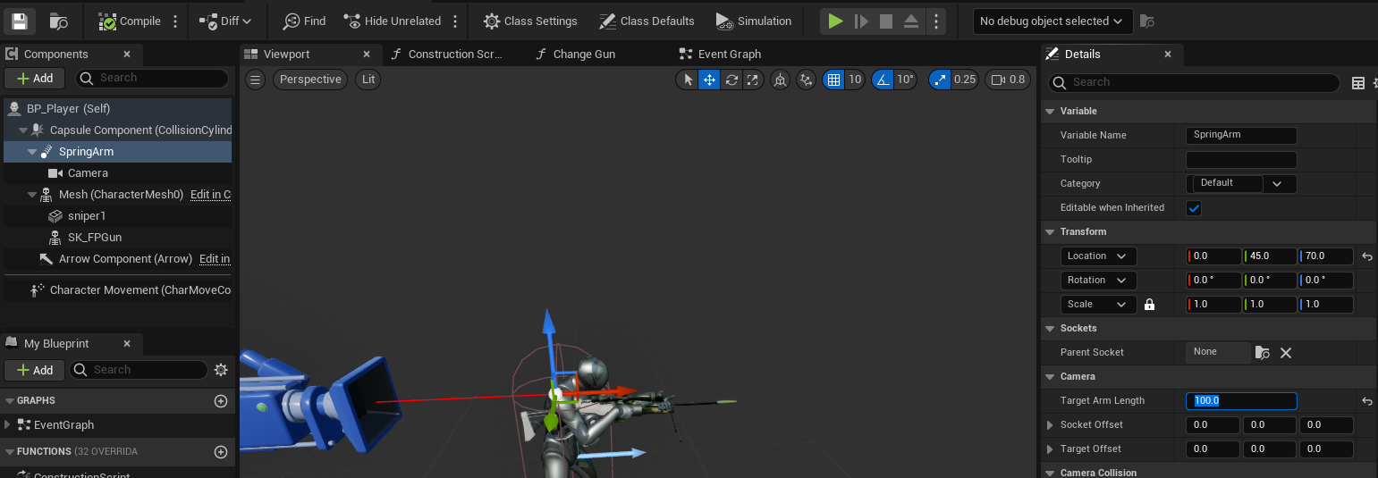 총 쏘는 모습을 더 잘 보기 위해서 SrpingArm의 [Target Arm Length]는 100으로 줄이고, Y값은 35에서 45로 높였다.