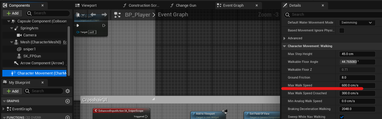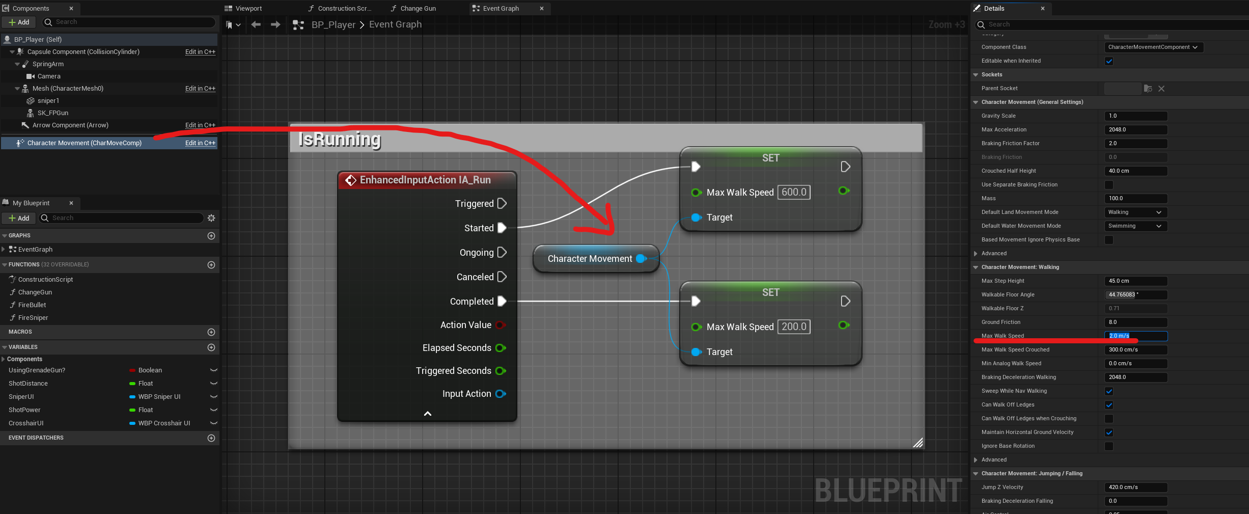 키를 누르고 있을 때(Started일 때) Character Movement의 Max Speed를 600으로, 뗐을 때(Completed일 때) 200으로 설정한다. Character Movement의 Max Speed의 초기 값은 200cm/s로 설정.