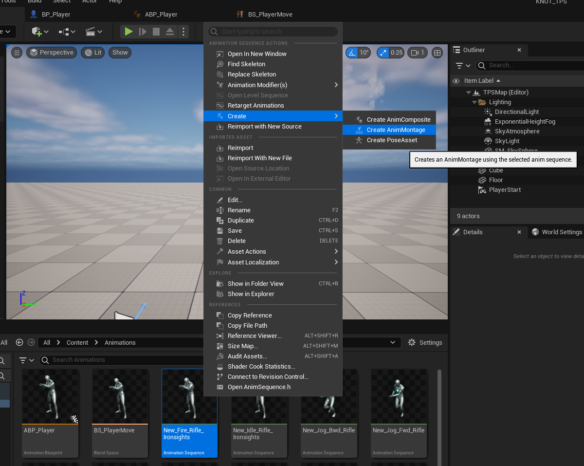 Retarget한 Fire 애니메이션을 우클릭, [Create] - [Create AnimMontage]를 누르면 몽타주 사용 가능.