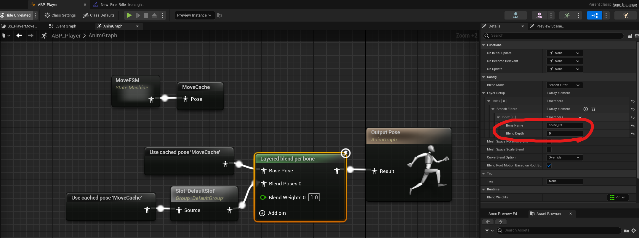 캐싱한 FSM을 사용하여 아래와 같은 노드 연결을 하고, [Layered blend per bone] 노드를 눌러서 우측에서 index에 "spine_03"을 입력하면 발사할 때 어깨가 움직이는 것을 볼 수 있다.