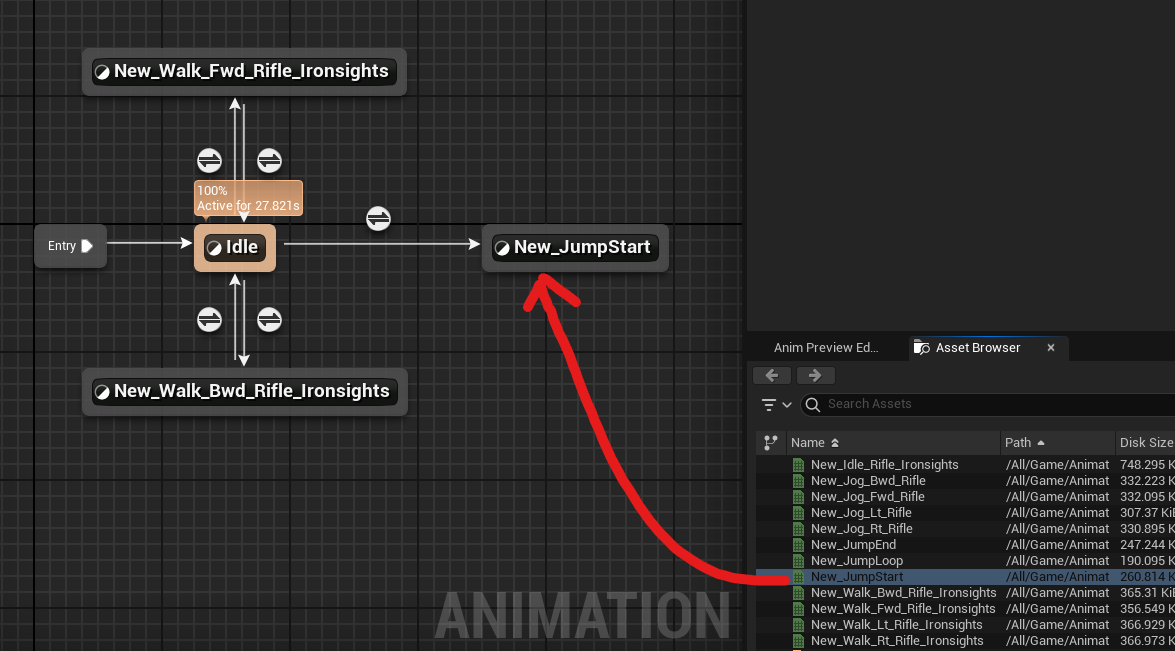 점프를 위해서 New_JumpStart 애니메이션 드래그해서 넣는다.