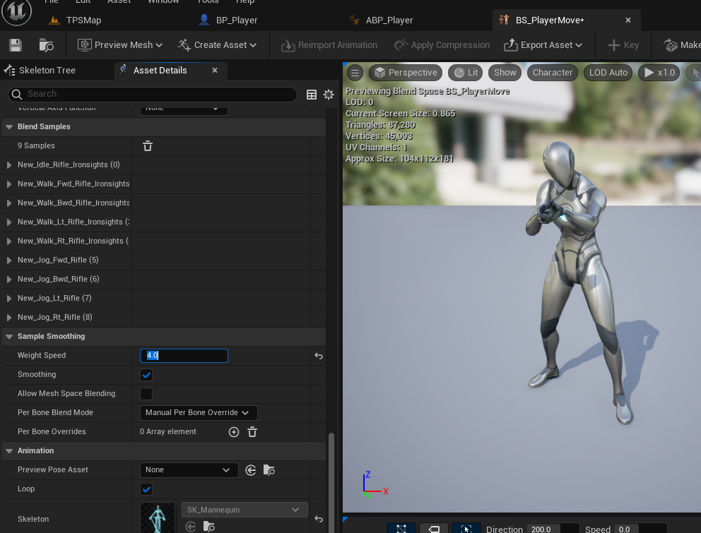 좌우로 전환할 때 약간 버벅이는 느낌이 있어서 BS_PlayerMove에서 Weight Speed 값을 0에서 4로 올리니 더 부드러운 전환이 가능하다.