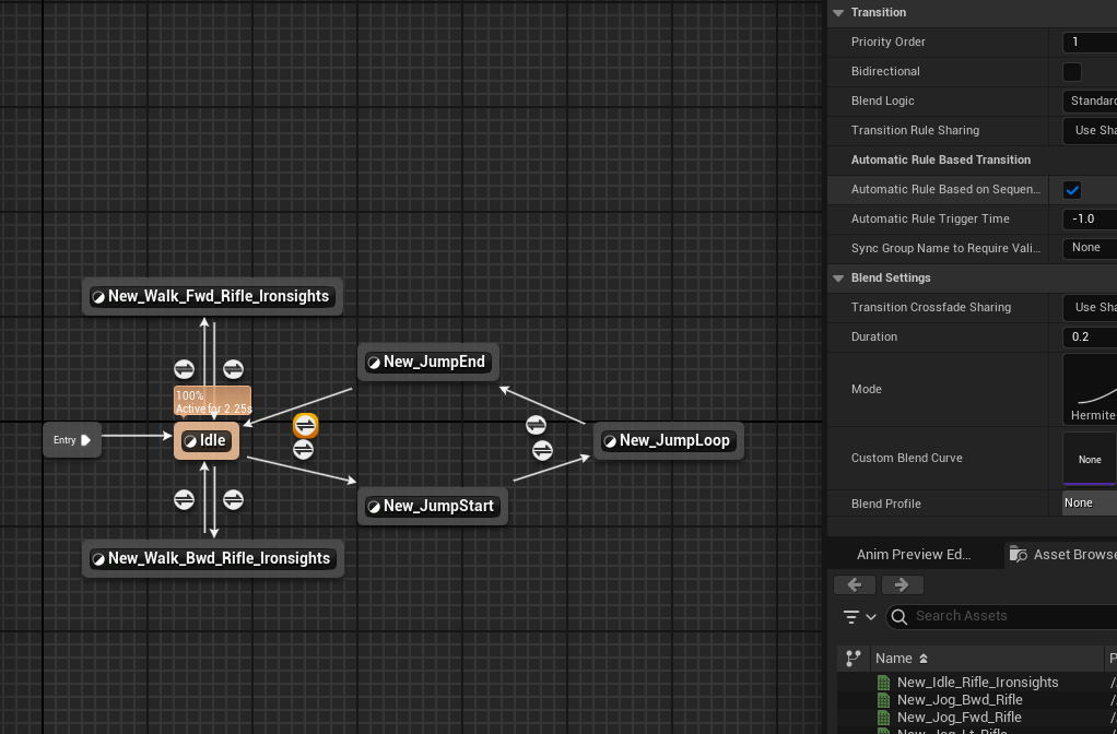 점프 애니메이션으로 가는 트랜지션 더블 클릭해서 편집. 공중에 떠 있을 때 점프를 시작하도록 한다.