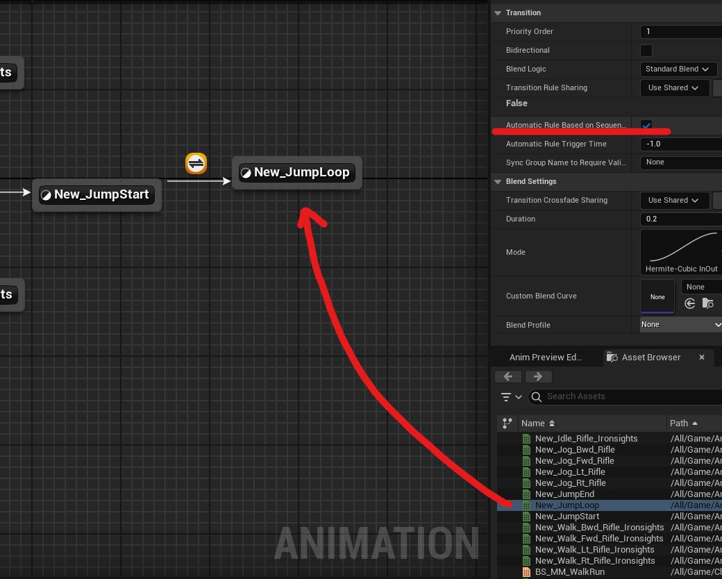 New_JumpLoop 추가, [Automatic Rule Based on Sequence]를 체크하면 자연스럽게 blend 되면서 애니메이션이 연결된다. 자동으로 연결된다는 말.