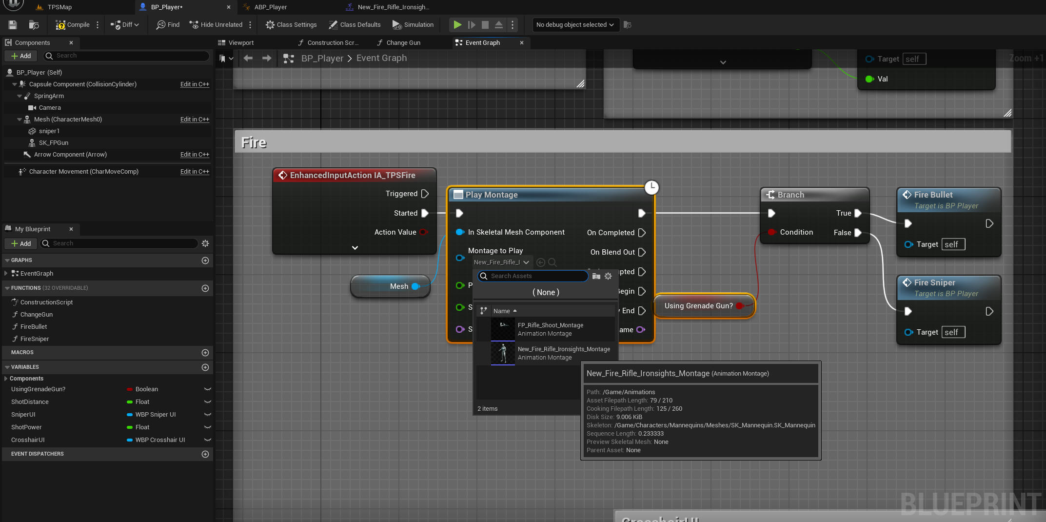 ABP_Player의 EventGraph로 와서, 발사와 관련 있는 노드를 수정한다.