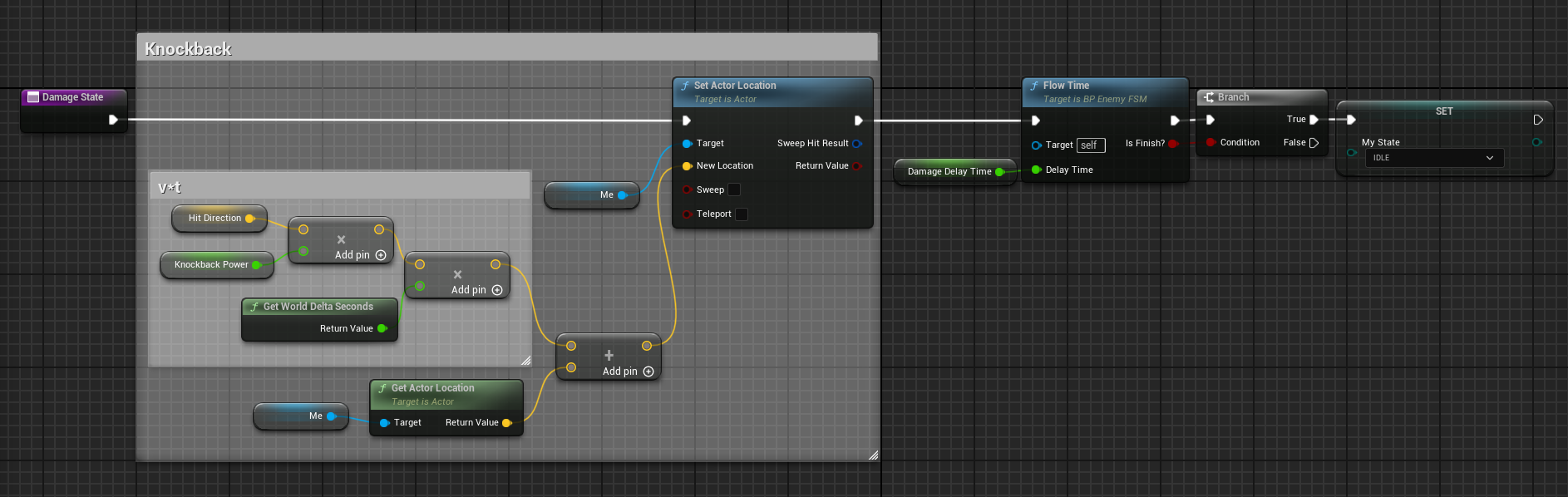 Knockback 코멘트 묶음은 잘라내기 해서 Damage State에 붙여넣고, 남은 노드를 연결한다.