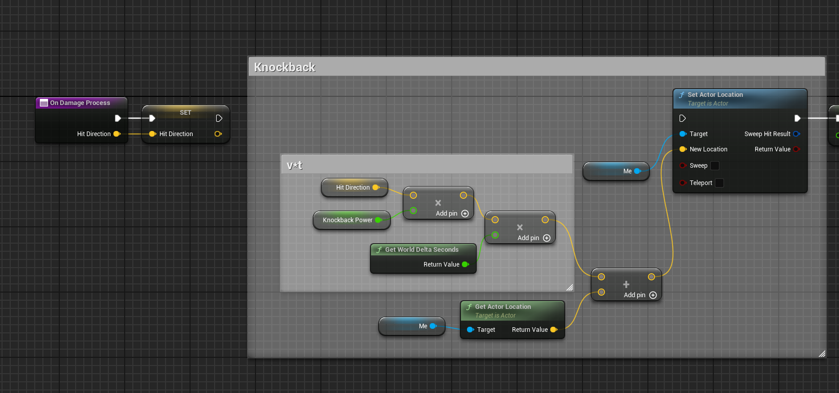 그리고 함수의 시작 부분에 Hit Direction을 벡터로 하고 Kockback Power를 크기로 하는, P = P0 + v*t의 공식을 이용하여 움직임을 뒤로 줄 것이다.