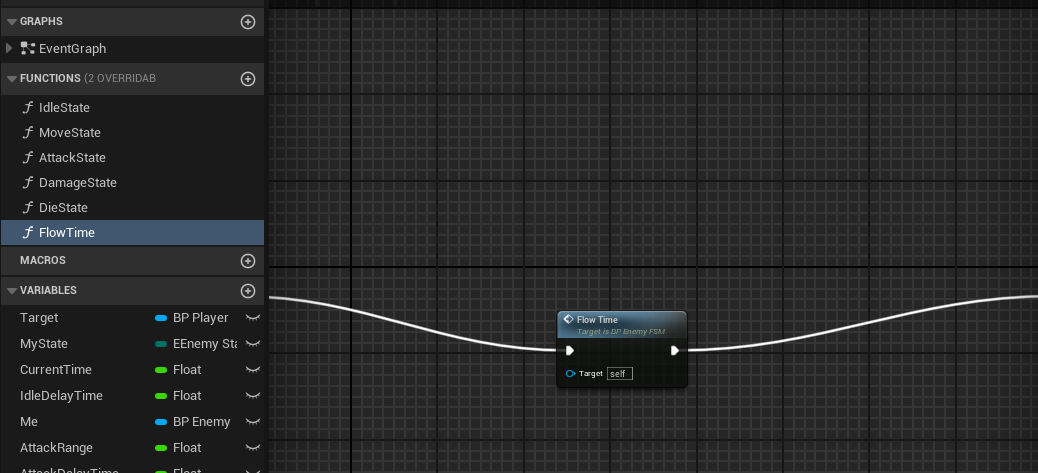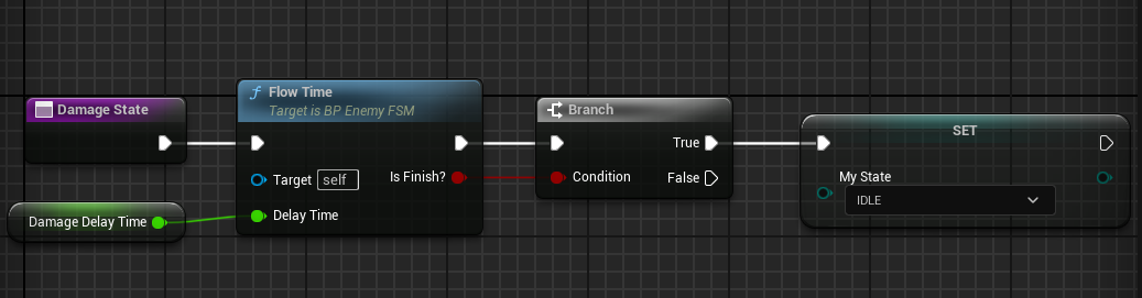 이전 State에서 시간이 흐르는 함수를 만들었다. [Flow Time] 함수를 끌어놓고 DamageDelayTime 변수를 연결한다.