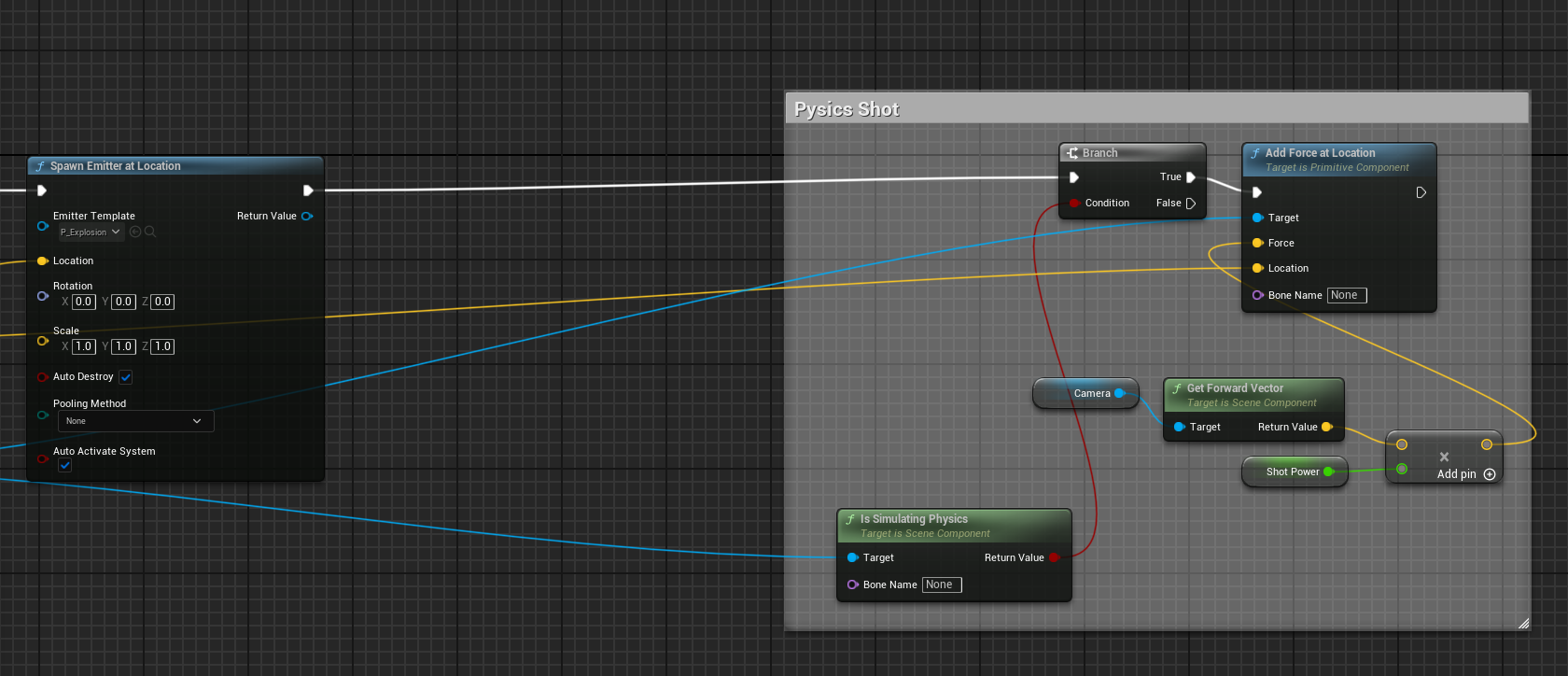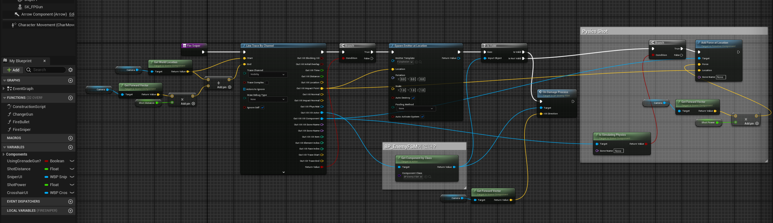 BP_Player에 FireSniper 함수를 연다. 물리적으로 날려보내기 전에 데미지를 입히는 노드를 넣을 것이다.
