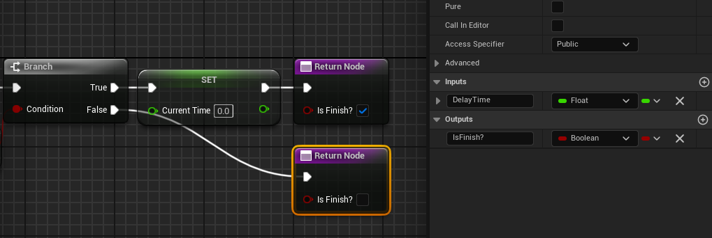 Outputs에도 "IsFinish?" 이름의 Boolean ouput을 하나 생성해서 맨 뒤 노드에 연결한다. True로 끝났으면 체크를, False로 끝났으면 체크를 하지 않는다.