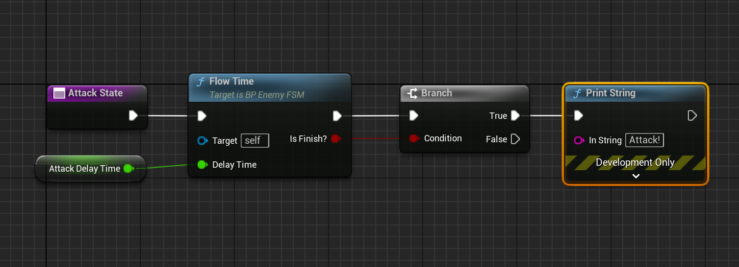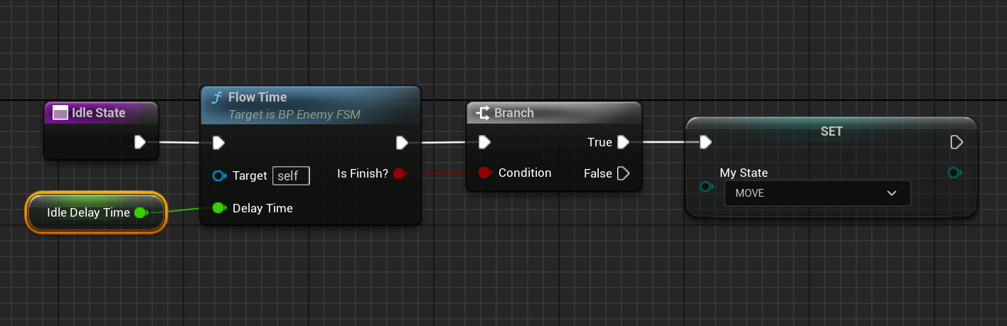 IdleState 함수에서 [Branch] 노드를 하나 만들고 IsFinish?가 True일 때 상태를 변경하도록 만든다. Input 자리에 IdleDelayTime을 연결한다. Attack 상태에서는 AttackDelayTime을 연결하면 될 것이다.
