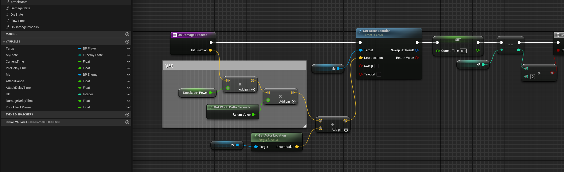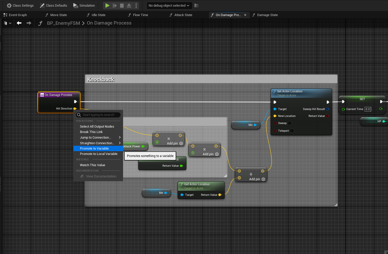 OnDamageProcess의 넉백 부분을 Damage State로 옮긴다. Knockback으로 감싼 코멘트 부분을 통으로 옮길 건데, HitDirection은 현재 지역변수이기 때문에 전역변수로 변환하기 위해서 [Promote to Variable] 한다.