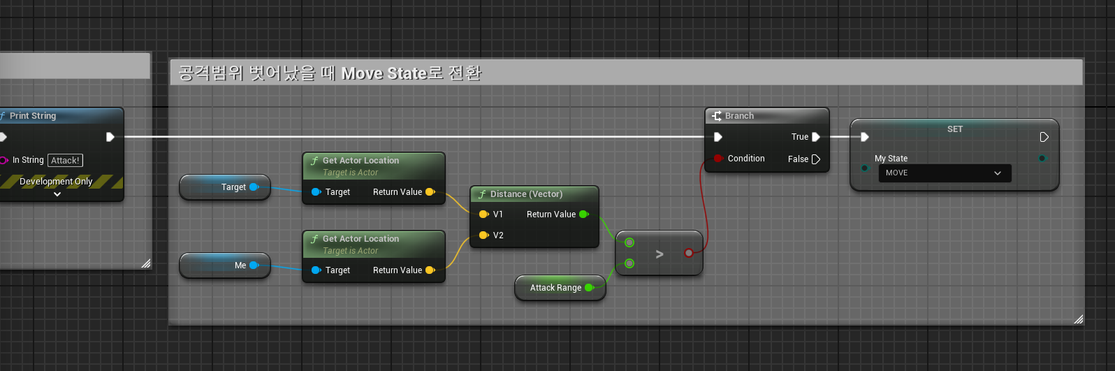 Attack State에서 노드를 추가한다. 타겟과 나의 거리의 차이가 Attack Range 변수 값보다 커지면 다시 Move State로 변환한다.