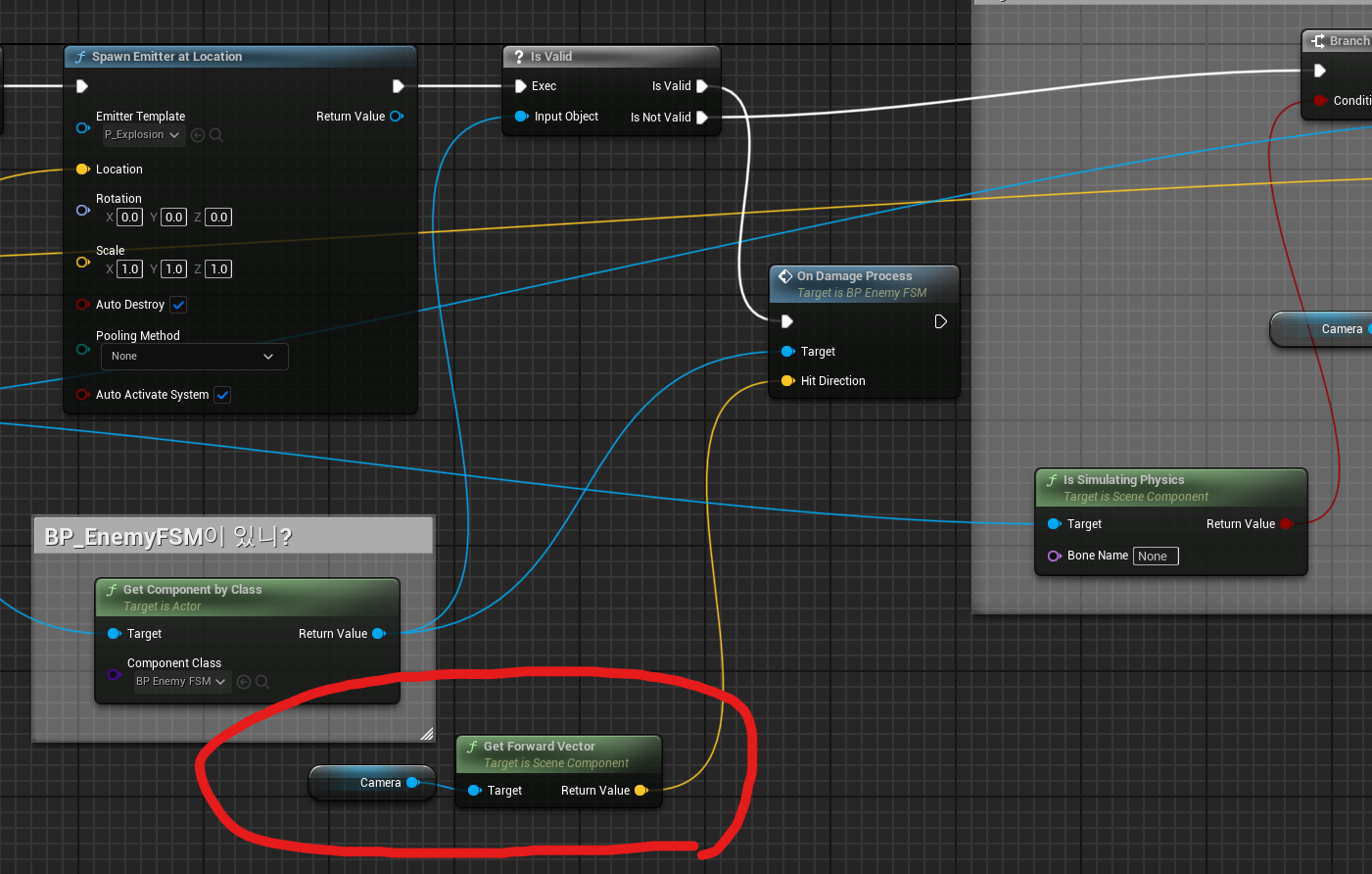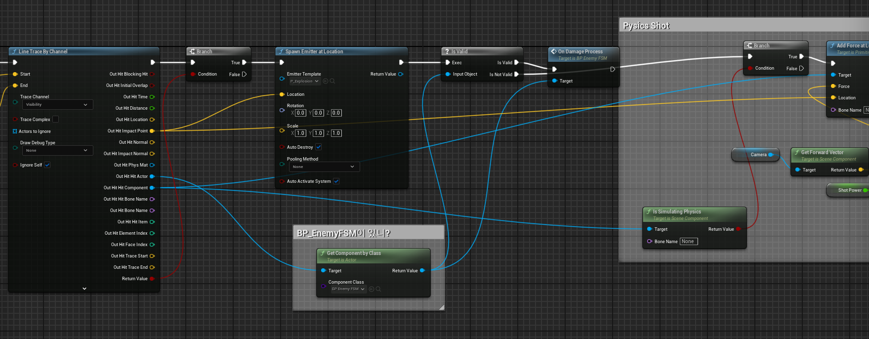 [Get Component by Class] 노드에서 BP_EnemyFSM을 가지고 있는지 [Is Valid]를 이용해서 판단한 후 유효하면 [On Damage Process]를, 아니라면 큐브를 날려보냈던 것처럼 이후 물리적 충돌을 이어나가면 된다.