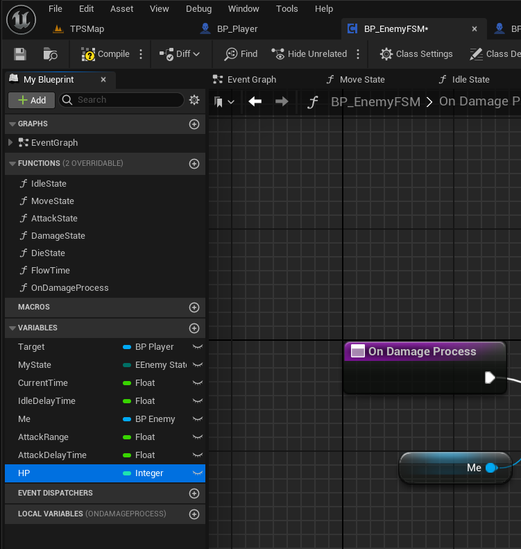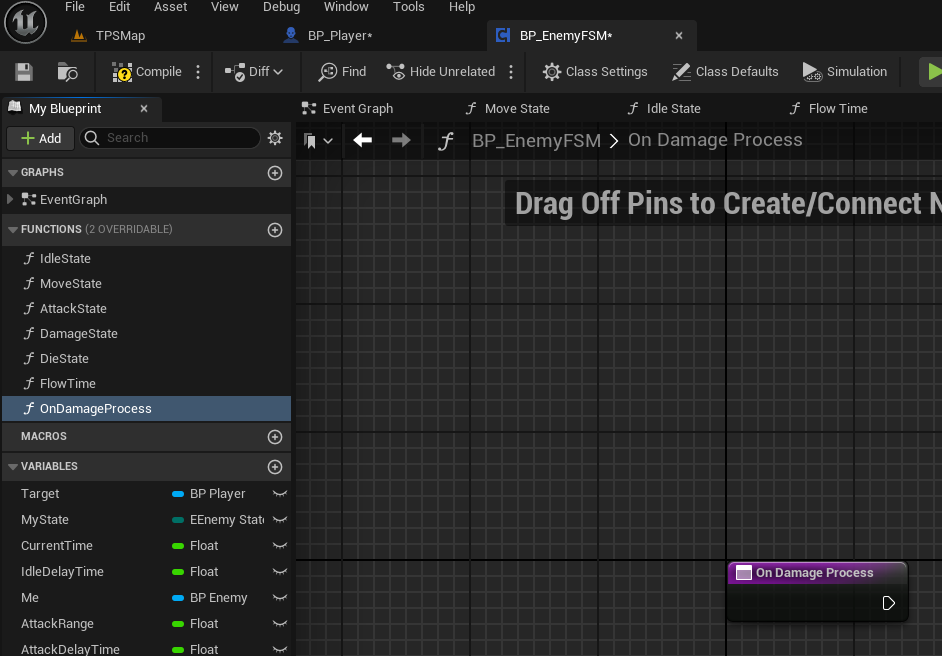 그 전에 BP_EnemyFSM으로 가서, OnDamageProcess 이름의 함수를 하나 만들었다.