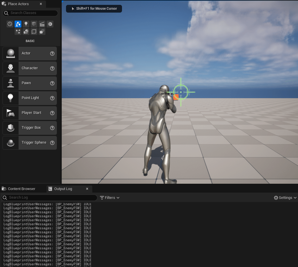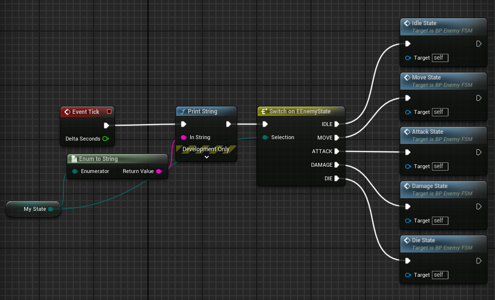 이 상태에서 실행해서 쏘면 Idle -> Damage -> Die로 바뀌는 것을 볼 수 있다. (BP_EnemyFSM에 [Print String]을 연결했을 때)