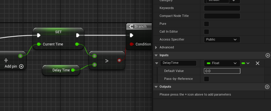 우측 Details에 보면 Inputs가 있다. 여기에 + 버튼을 눌러 input을 하나 추가하고 float 형의 "DelayTime"을 생성했다.