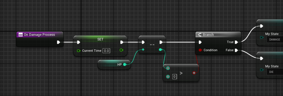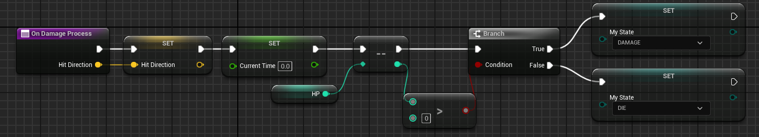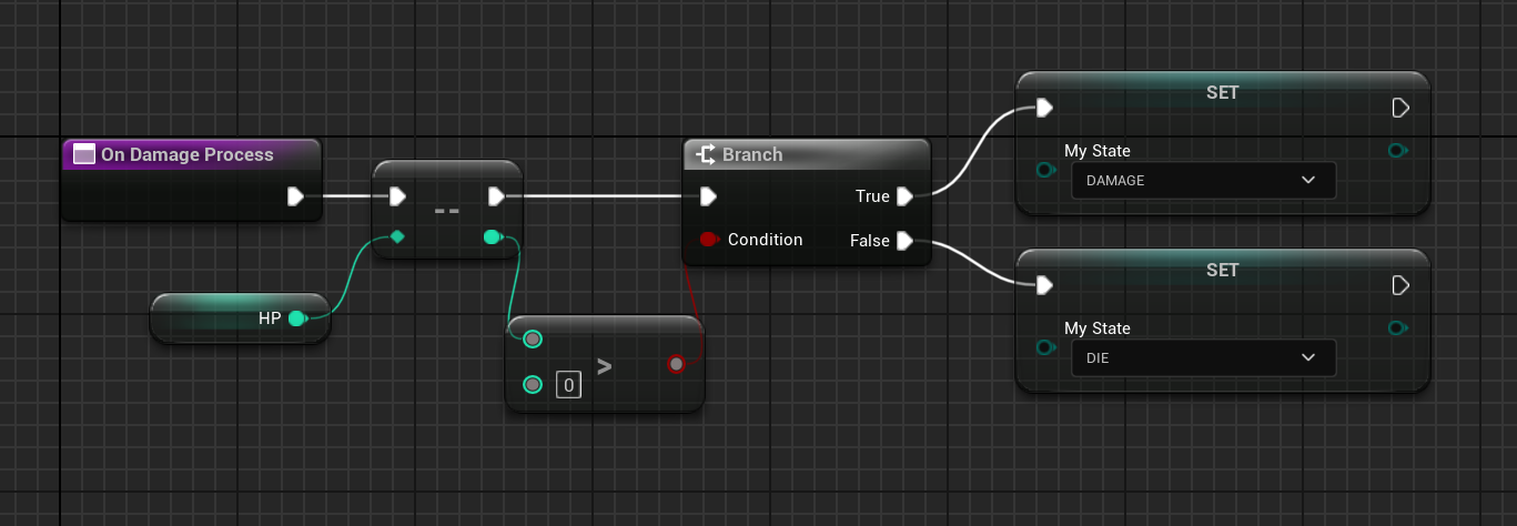 HP 변수를 --로 하나씩 빼고 0보다 아직 크면 Damage 상태, 0보다 작으면 Die 상태로 설정했다.