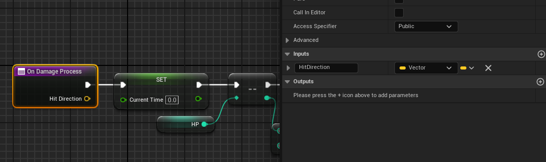 BP_Player로 돌아와서, OnDamageProcess에 Camera의 [Get Forward Vector] 값을 Hit Direction에 연결하면 된다.