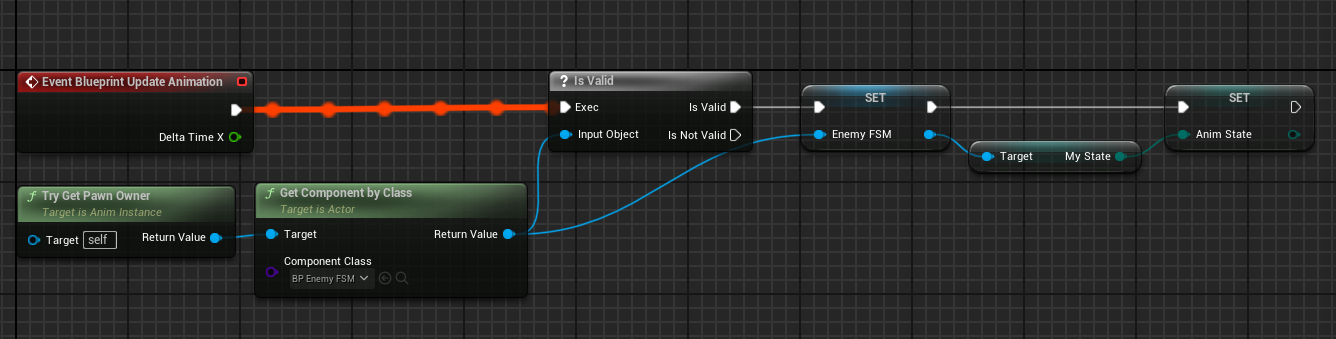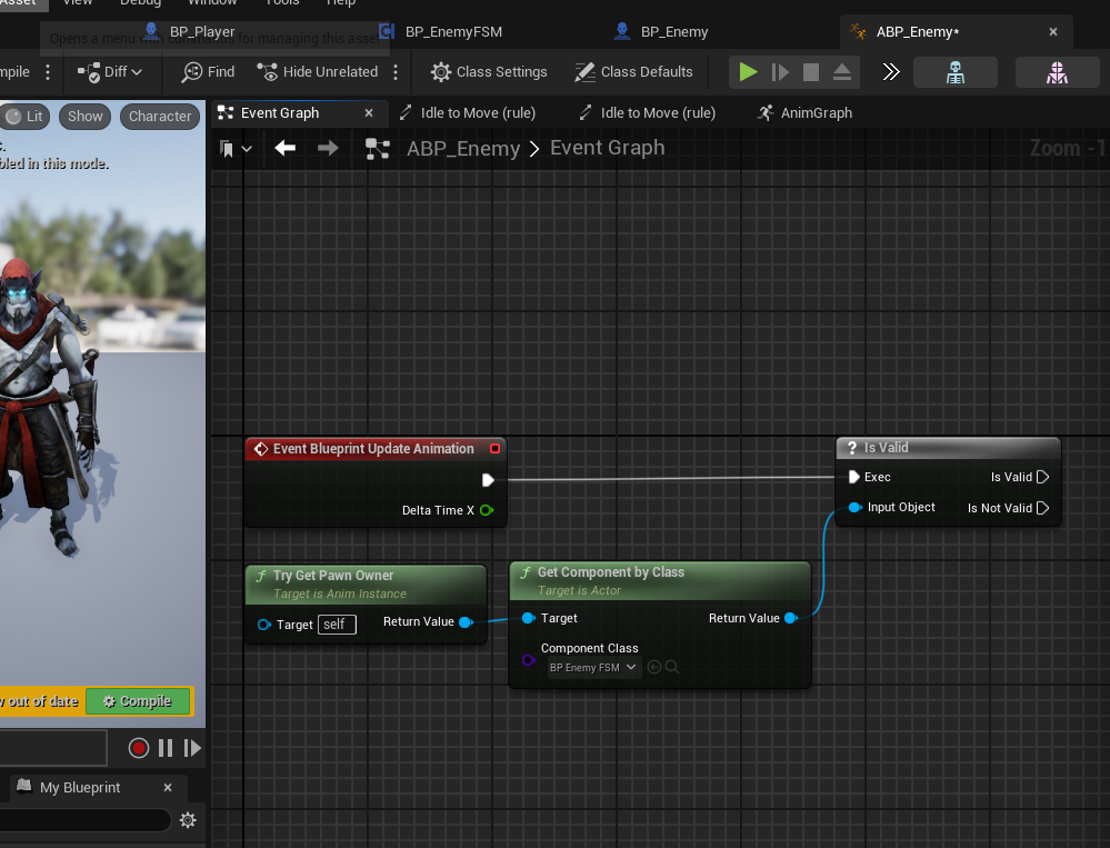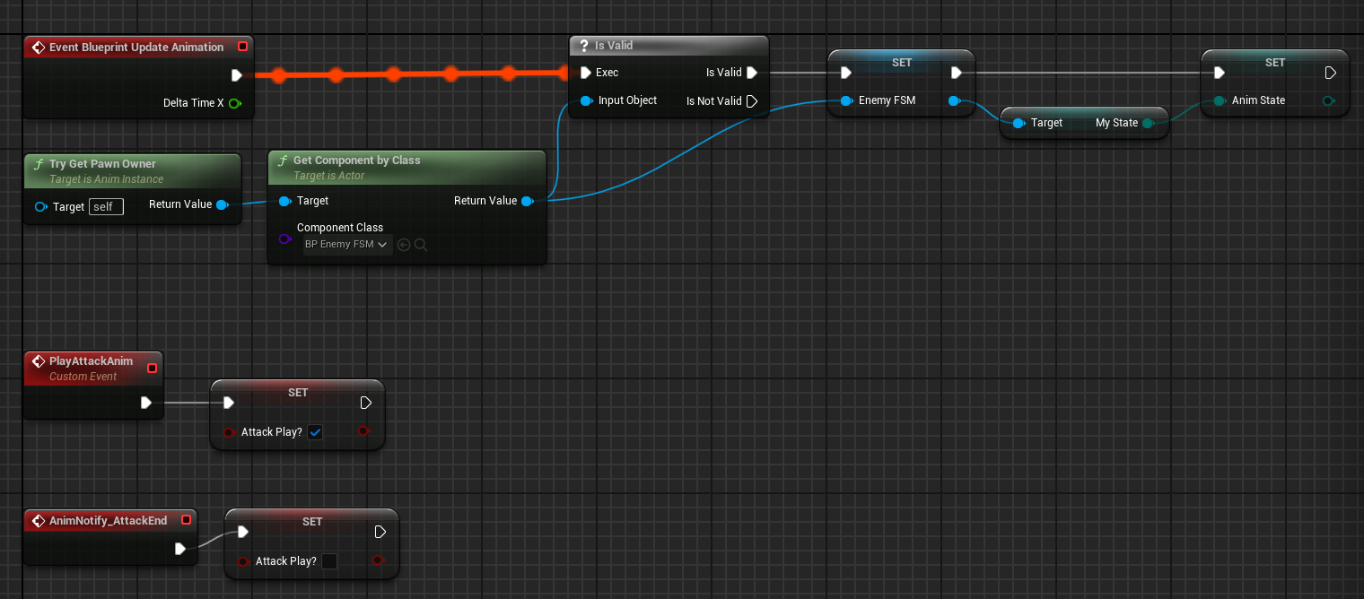 [Get Anim Instance] 노드를 이용해서 Animation instance를 가져오고 ABP_Enemy로 cast 하였다.