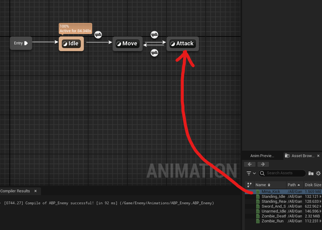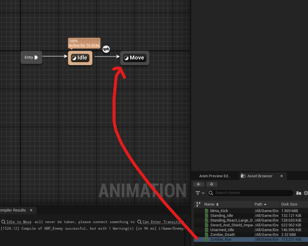 마찬가지로 Attack -> Move로 향하는 트랜지션은 Move로 상태를 만들어야 한다.