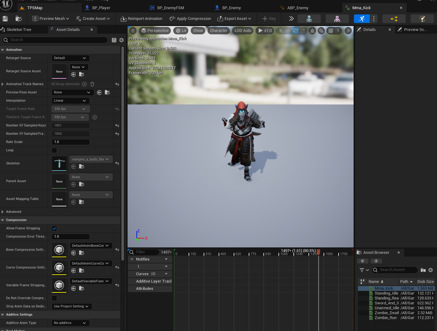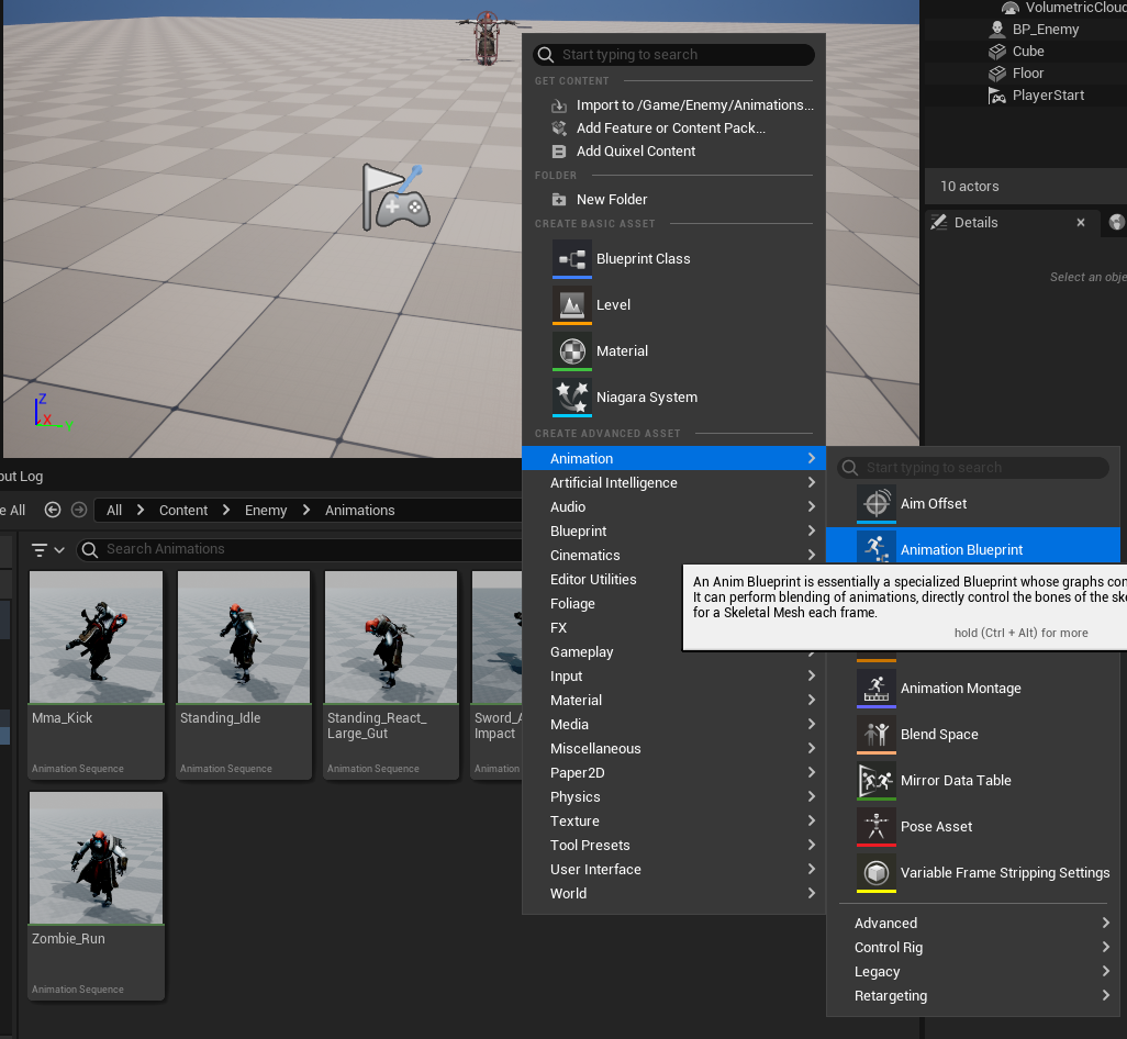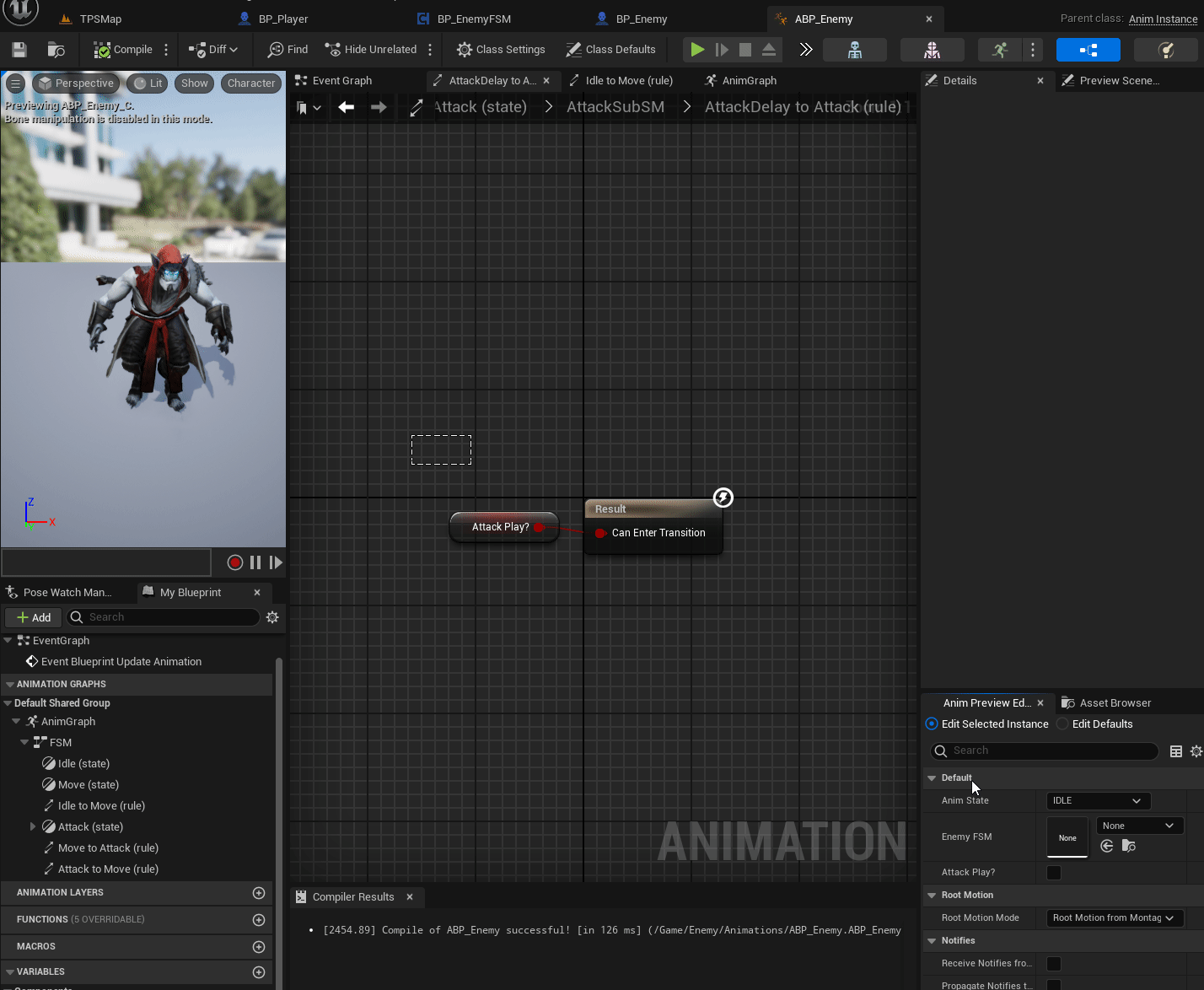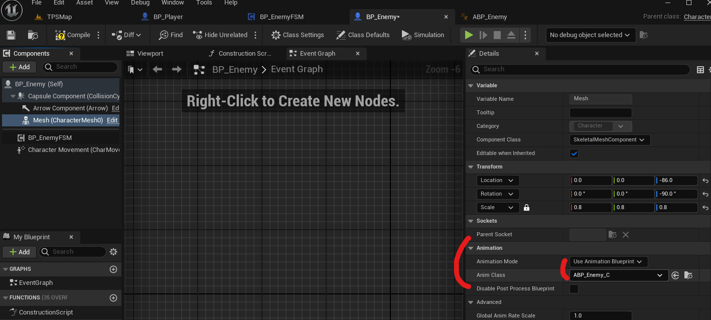 BP_Enemy로 와서, Mesh를 누르고 Details에 [Animation Mode] - [Use Animation Blueprint] 설정하고 [Anim Class] - [ABP_Enemy_C]를 적용한다.