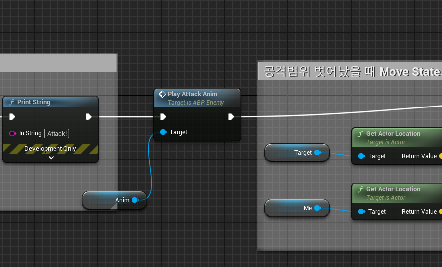 다시 BP_EnemyFSM의 Attack State에서 직접적으로 속성을 바꿔주는 것이 아니라 아까의 커스텀 노드를 불러와서 바꾼다.