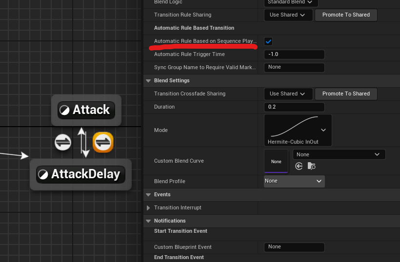 Attack 애니메이션이 끝나면 자동으로 AttackDelay로 넘어갈 수 있도록 [Automatic Rule Based on Sequence Play]를 체크한다.