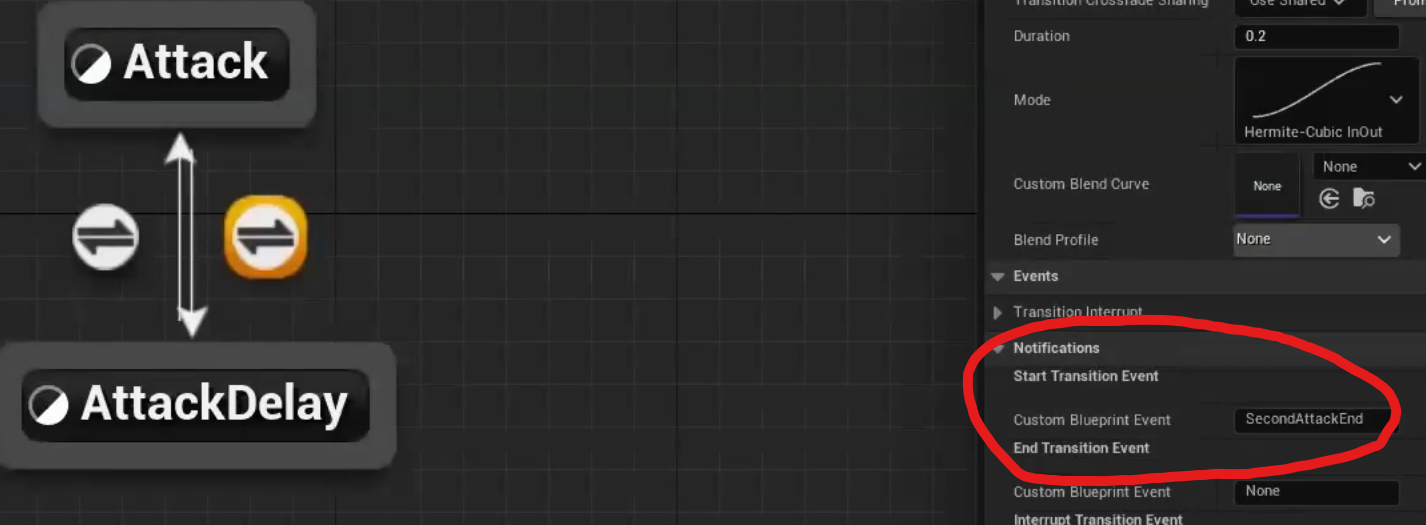다른 방법으로는 Attack -> AttackDelay 트랜지션을 클릭한 후 우측에서 Notifications에 Start 부분에 원하는 이름을 넣고,