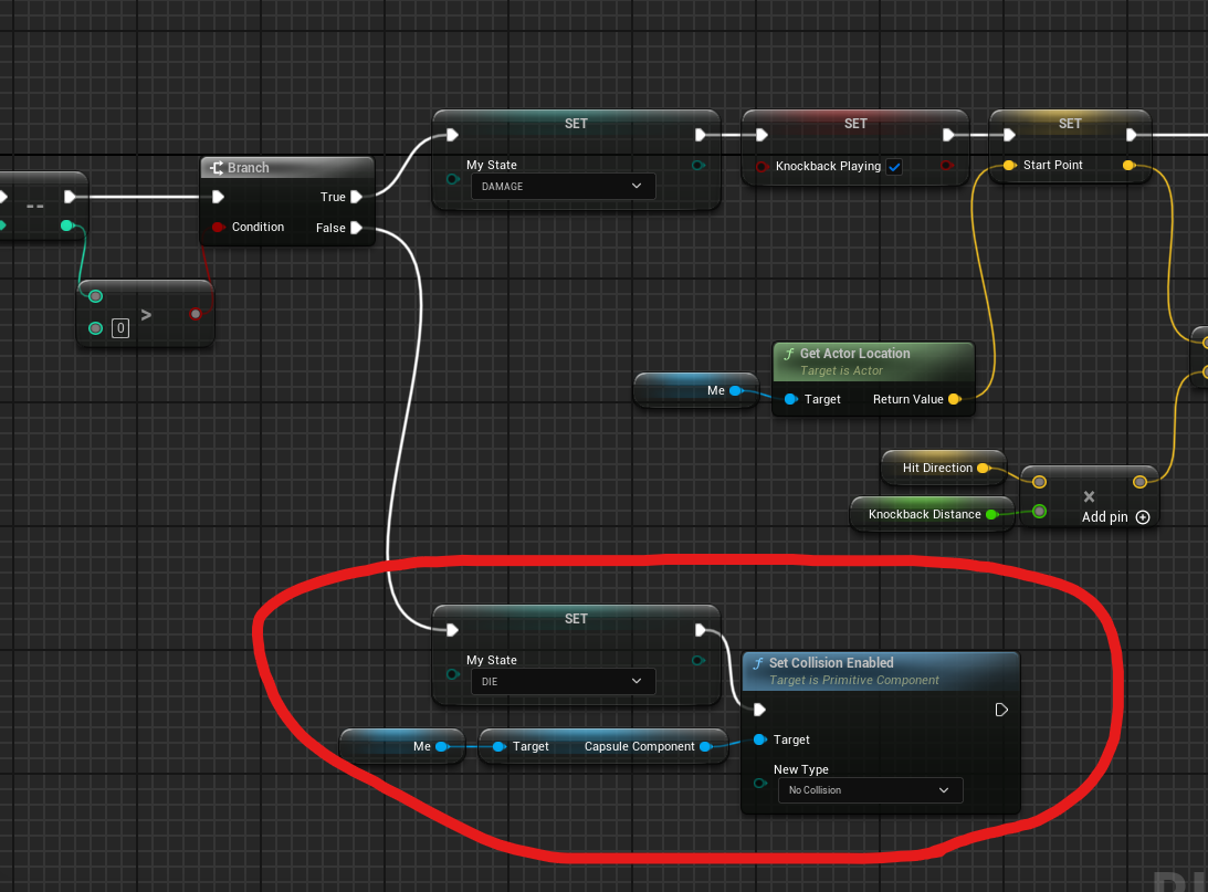OnDamageProcess 함수에서, 적의 Capsule Component에 No Collision을 부여했다.