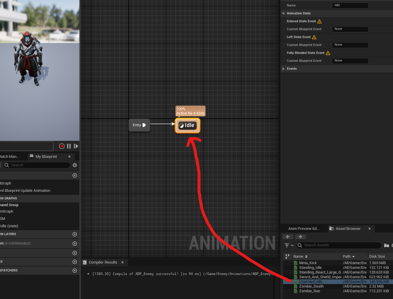 ABP_Enemy의 EventGraph에서 해당 이름 검색 후 연결해줘도 애니메이션이 연결된다.