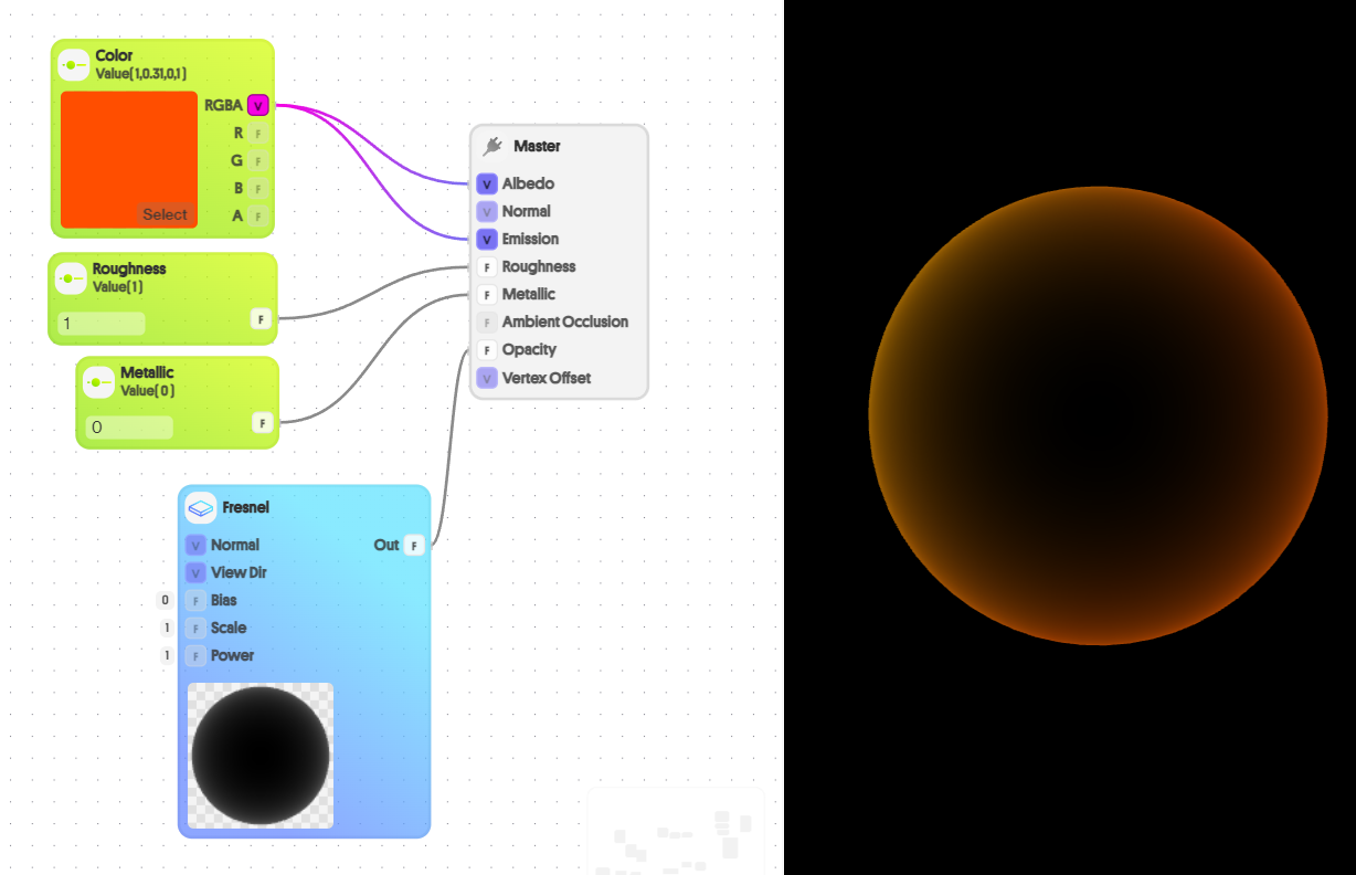 간단하게, NodeToy에서 Opacity 부분에 Fresnel 효과만 연결하고 적당한 Power 값을 적용하면 쓸 수 있다!
