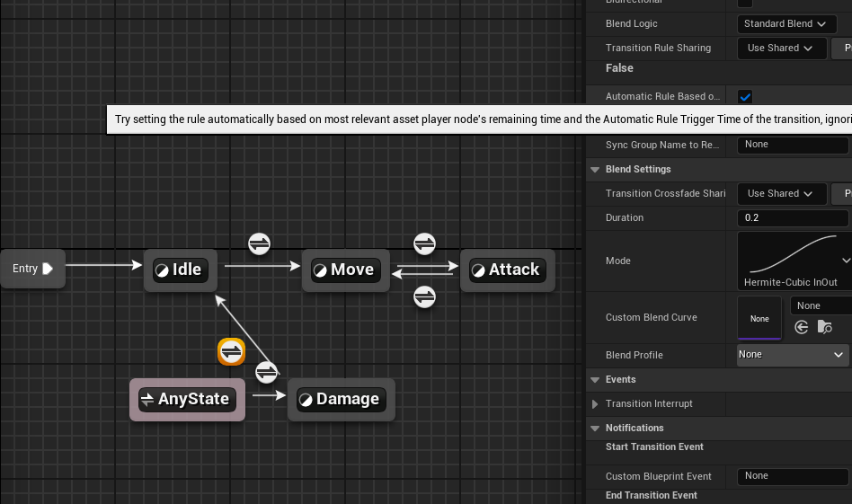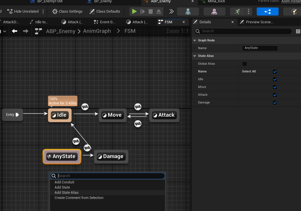 Add State Alias로 AnyState 이름을 생성하여 Damage 애니메이션과 연결하면 된다. 우측 Details에서 AnyState로 넘어갈 수 있는 다른 애니메이션을 체크하면 된다.