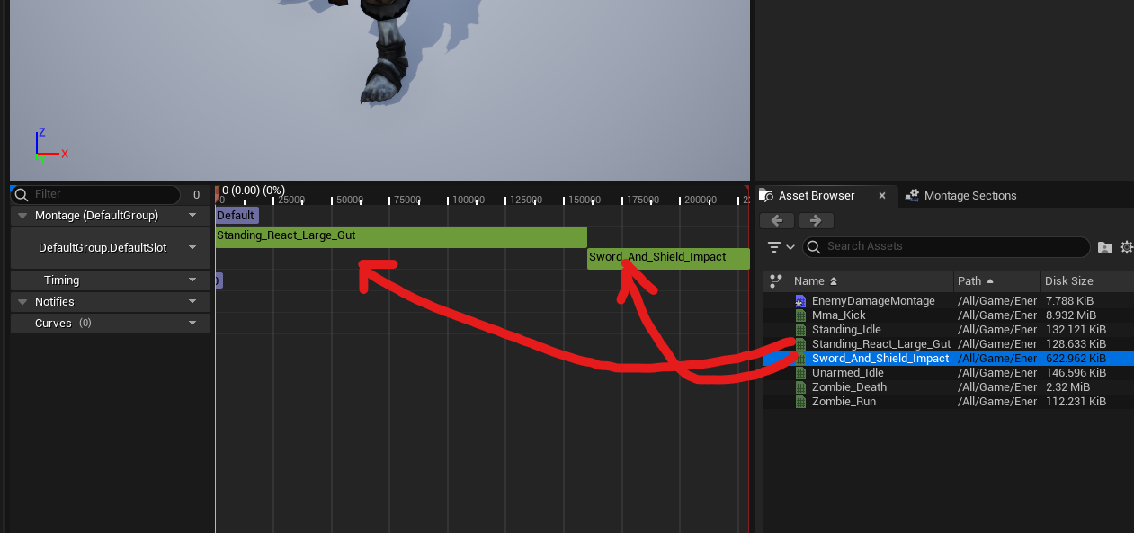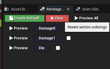 DefaultSlot의 우측에 드롭다운에서 MyDamageSlot으로 설정, 몽타주 창을 닫고 다시 열면 애니메이션이 실행된다.