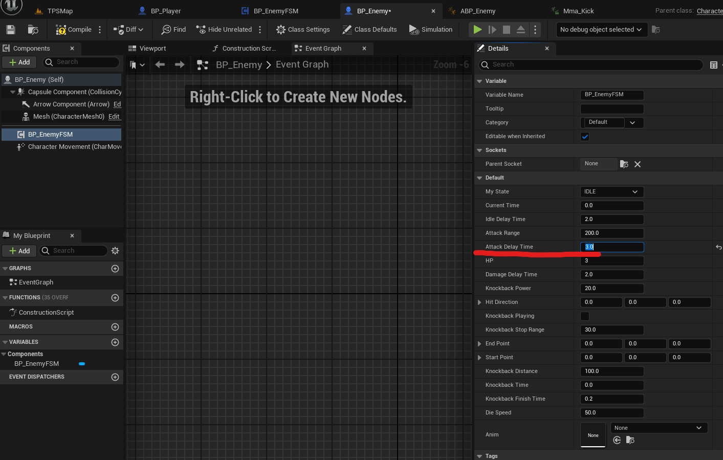 따라서 BP_Enemy의 BP_EnemyFSM을 선택해보면 Details 창에서 만든 변수를 수정할 수 있다.