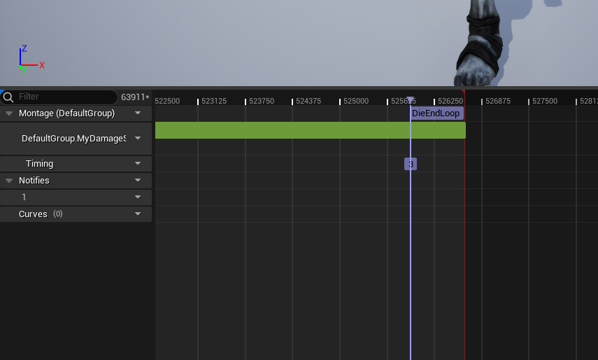 EnemyDamageMontage에서 가장 마지막 부분에 DieEndLoop 이름의 섹션을 하나 추가한다.