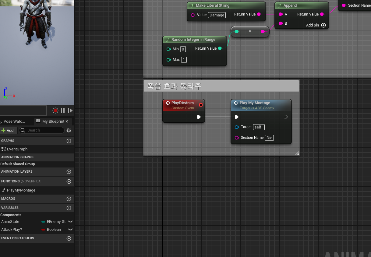 그 밑에 Custom Event로 PlayDieAnim 이름의 노드를 만들고 다시 함수를 가져와서 연결한다.