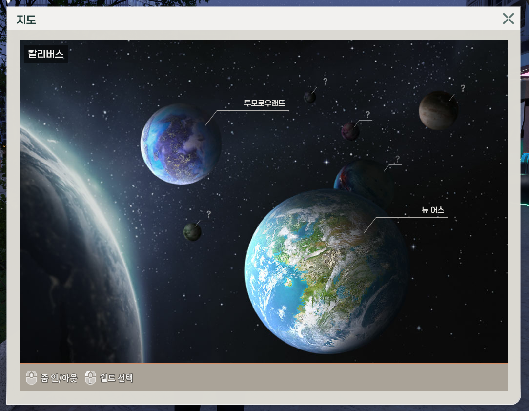 메타버스 세계의 기본이 되는 배경은 뉴 어스라는 행성에서 이루어지는 것으로 보인다. 투모로우랜드가 표시 되어있지만 아직 선택은 되지 않는다. 다른 행성에 물음표가 표시되어 있는 것으로 보아 향후 업데이트에 세계관 확장도 예상해볼 수 있다.