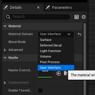 메테리얼을 더블클릭하여 들어가서 Domain을 User Interface로 변경한다.
