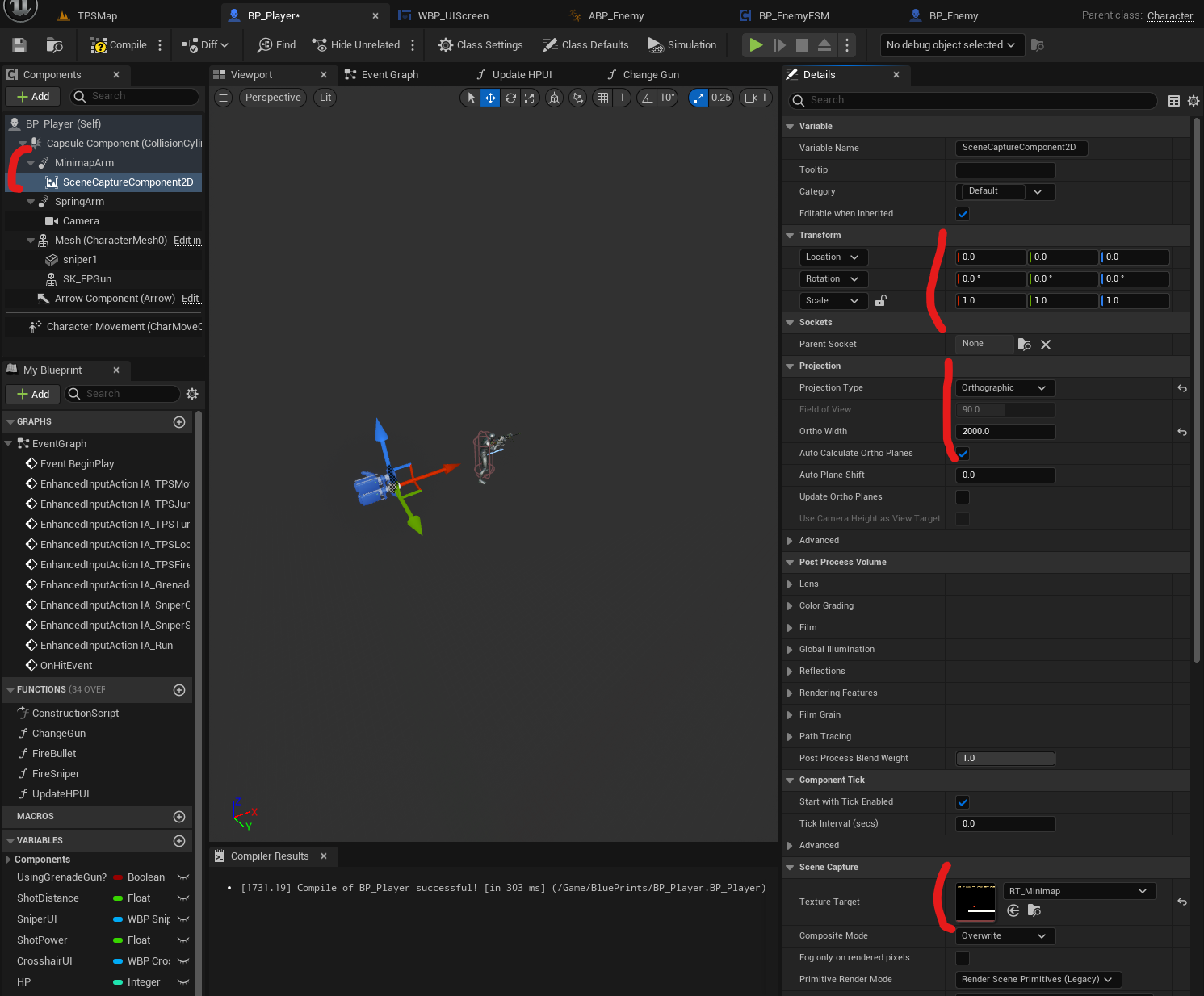 SpringArm 아래에 SceneCaptureComponent2D를 놓고 위치는 초기화하고 Ortho, 2000 설정, Render Target도 넣는다.