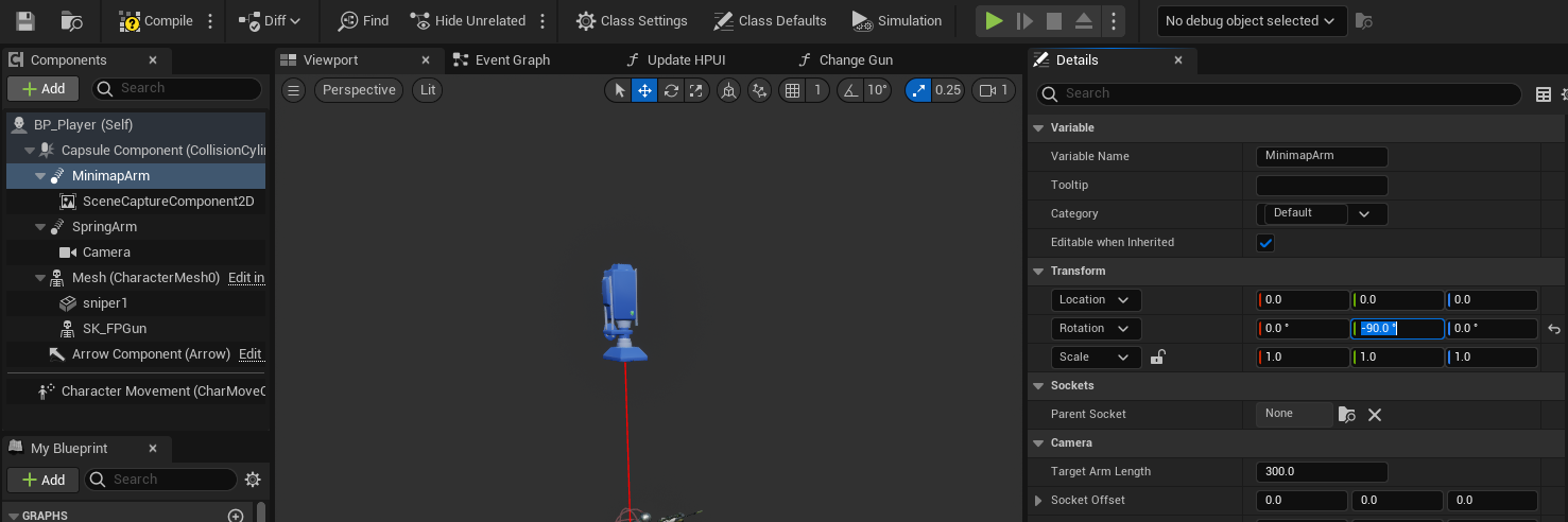 SpringArm은 아래를 보게 -90 각도를 준다.
