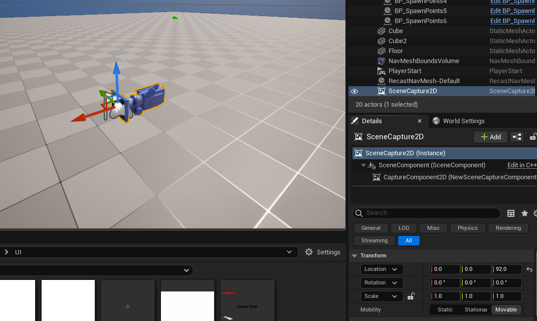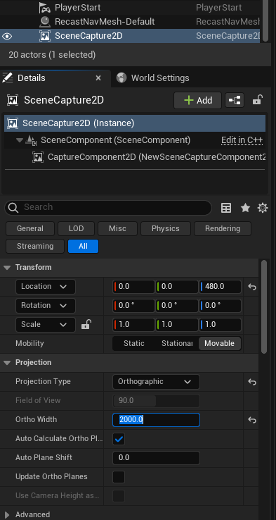Player Start의 Location 값을 복사해서 Scene Capture 2D 카메라에 붙여넣어 같은 Location을 설정했다.