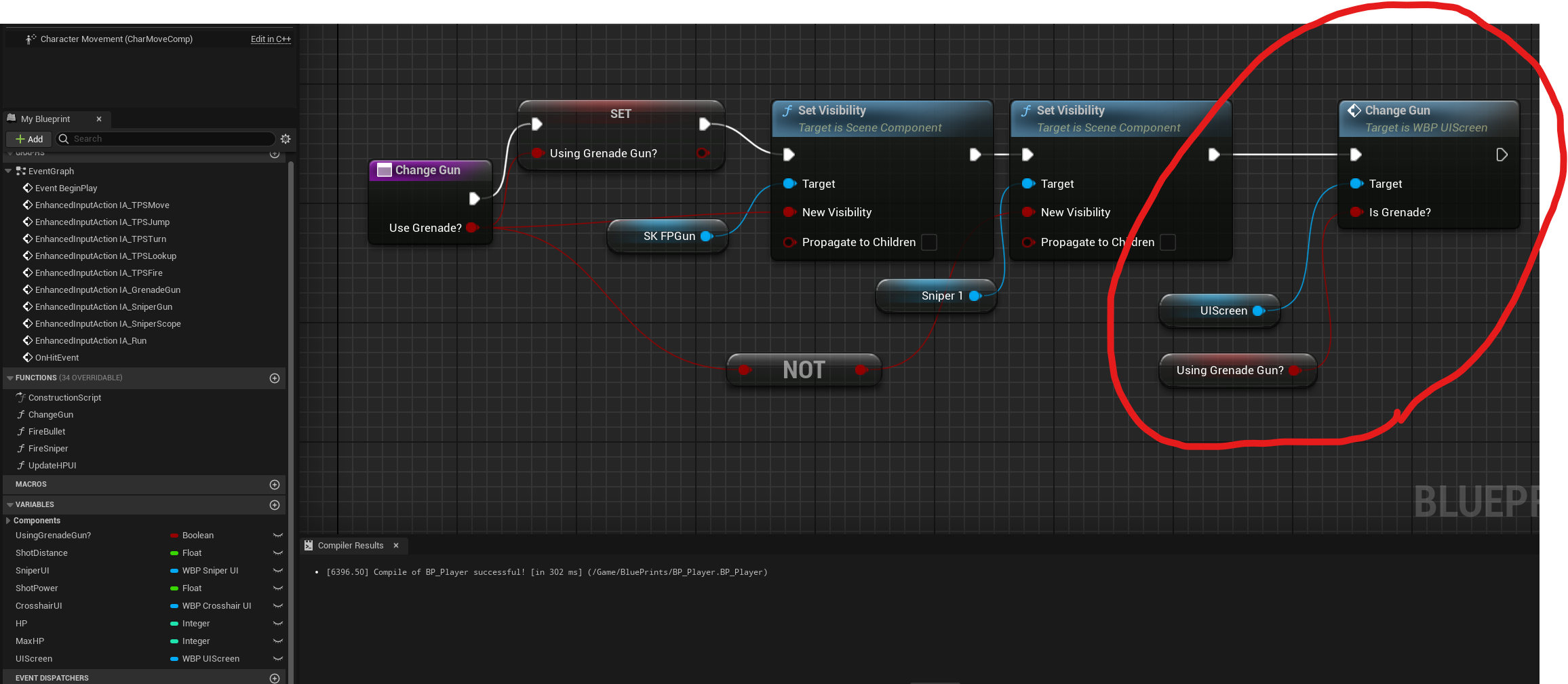 BP_Player의 BeginPlay 중간에 있는 ChangeGun을 UIScreen을 불러오는 부분 뒤로 옮겨야 한다.