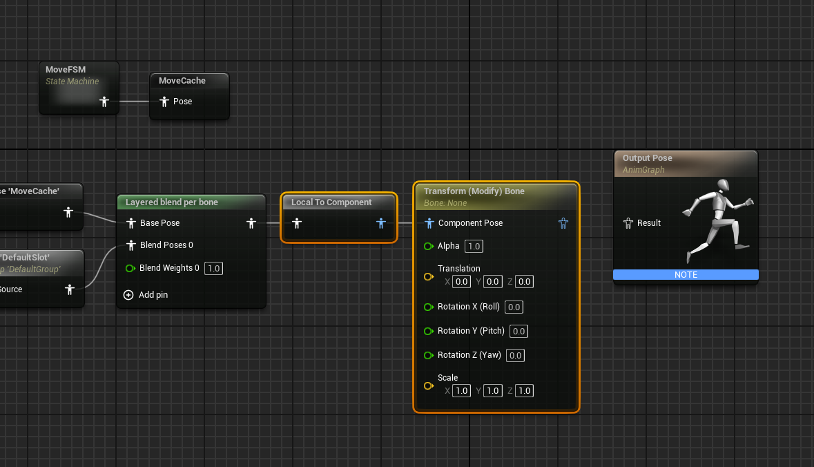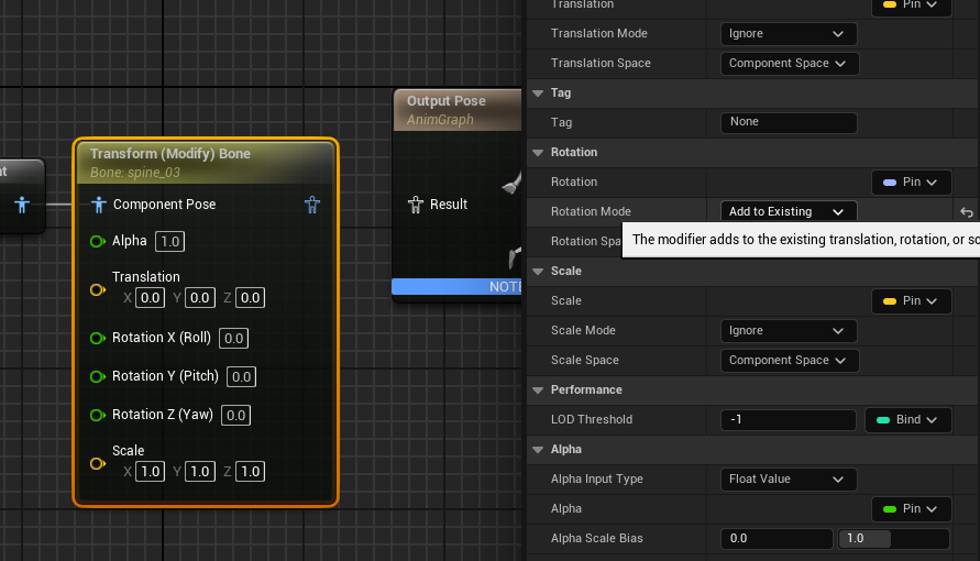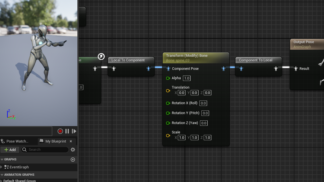 Transform (Modify) Bone 노드를 추가했다.