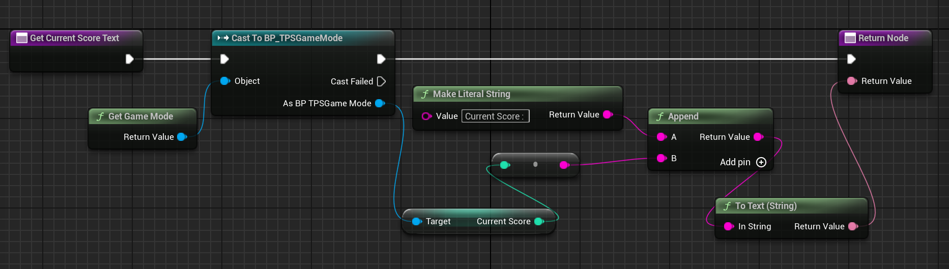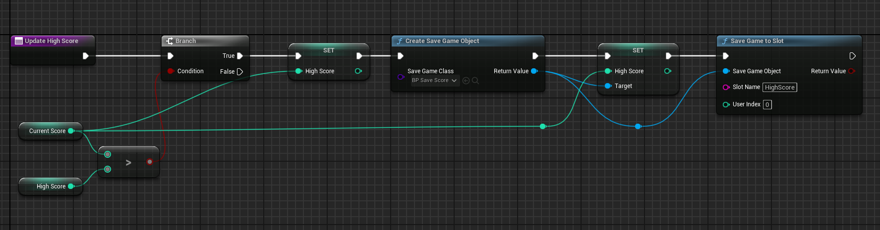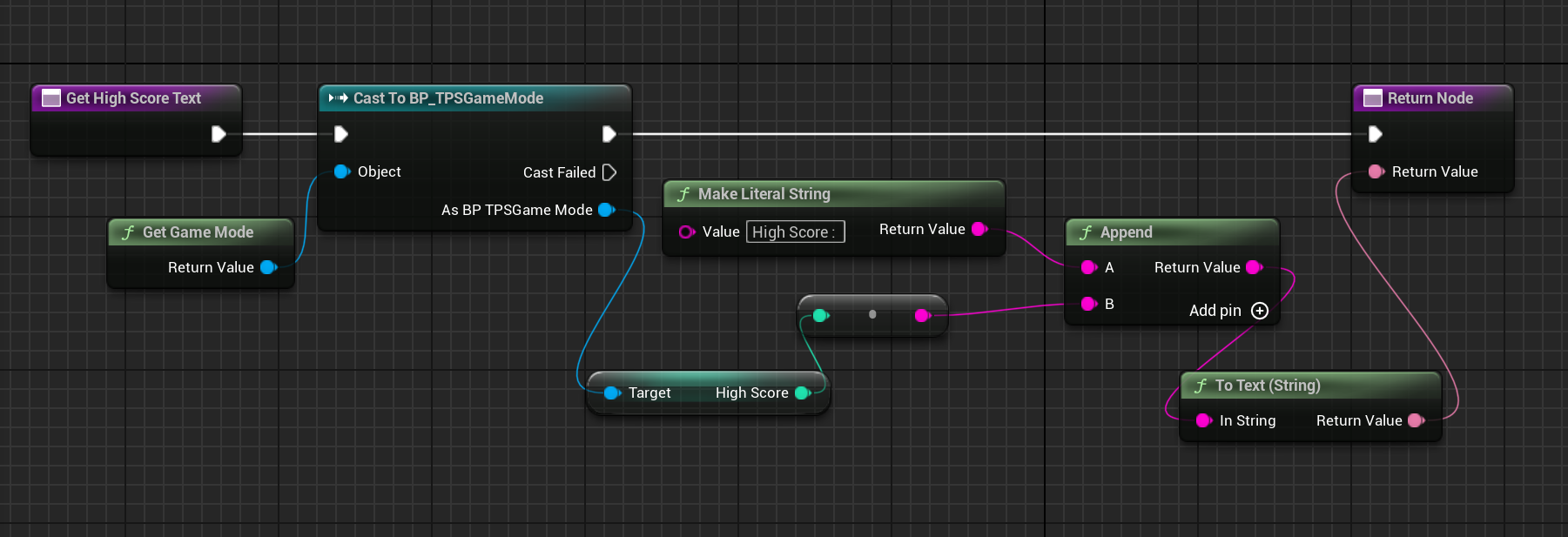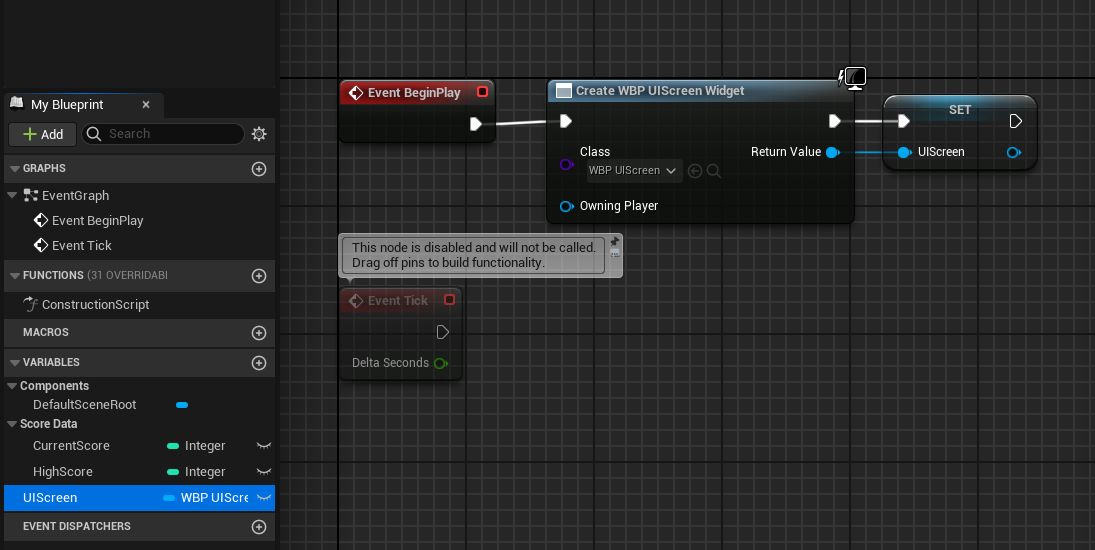 HighScore도 마찬가지로 Current Score에 썼던 노드 복사해서 텍스트를 "High Score : "로 변경하고 High Score 변수를 Get 하도록 바꿨다.