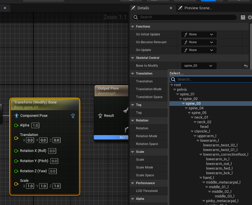 만든 노드의 Details에서 Bone to Modify를 spine_03으로 설정
