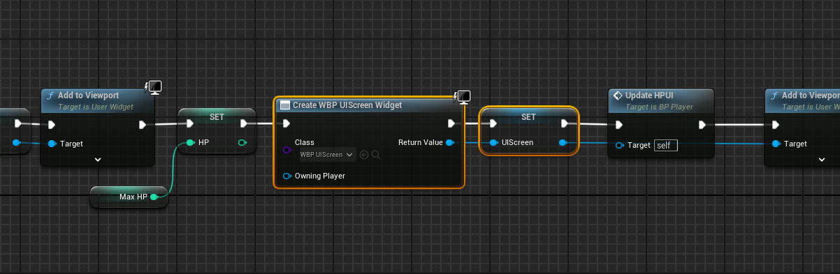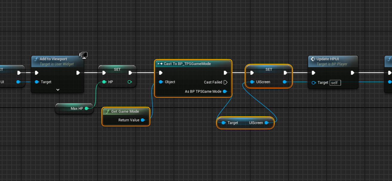 BP_Player의 EventGraph에서 BeginPlay 부분에 WBP_UIScreen을 불러오는 부분을 BP_TPSGameMode로 옮길 것이다.