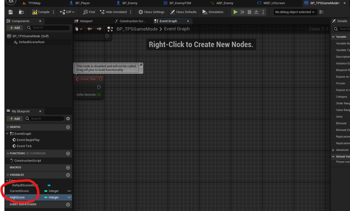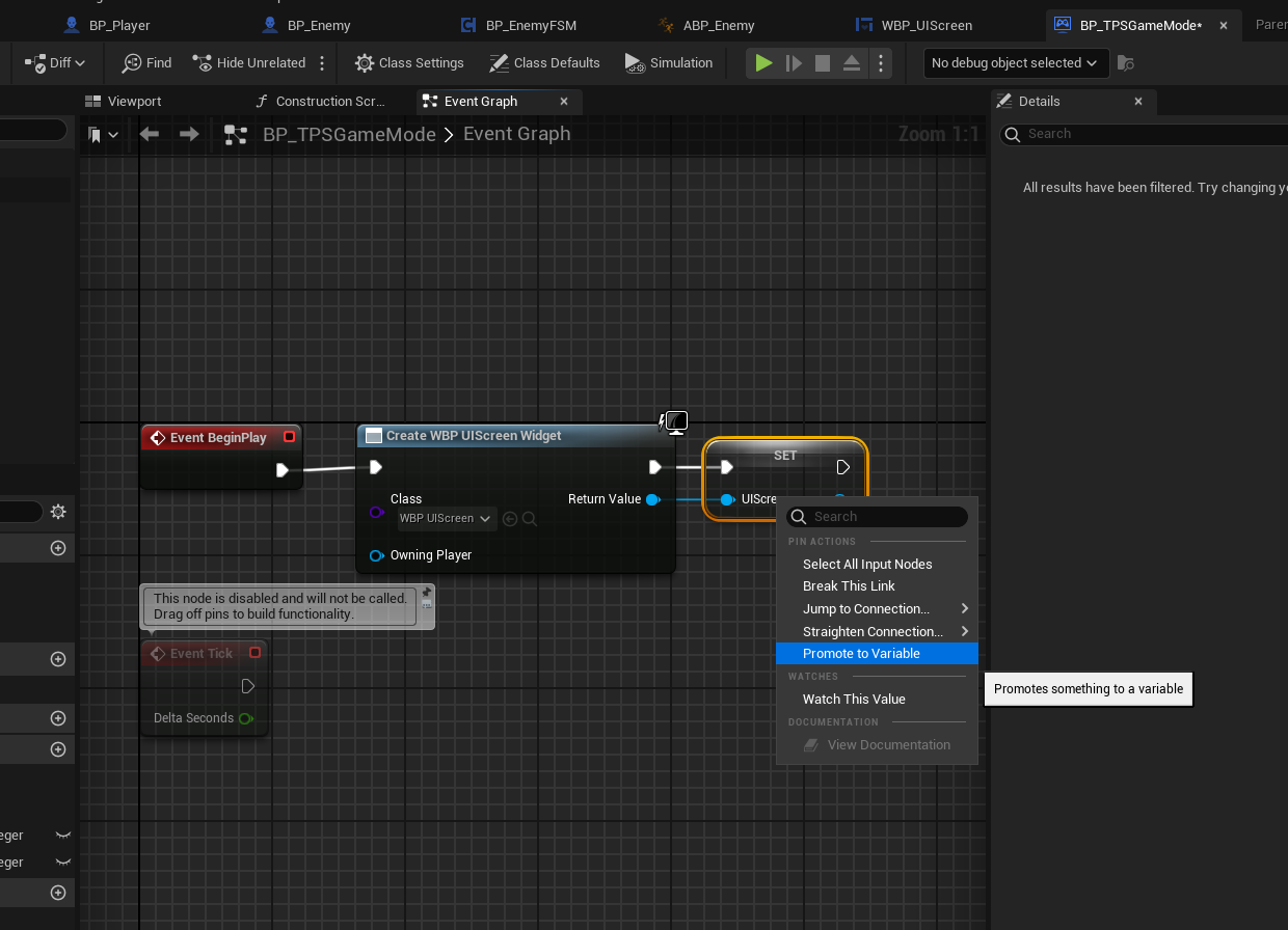 복사해서 BP_TPSGameMode에 가져온 후 UIScreen 부분 Promote to Variable