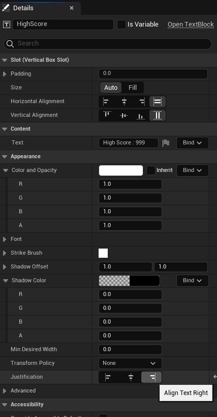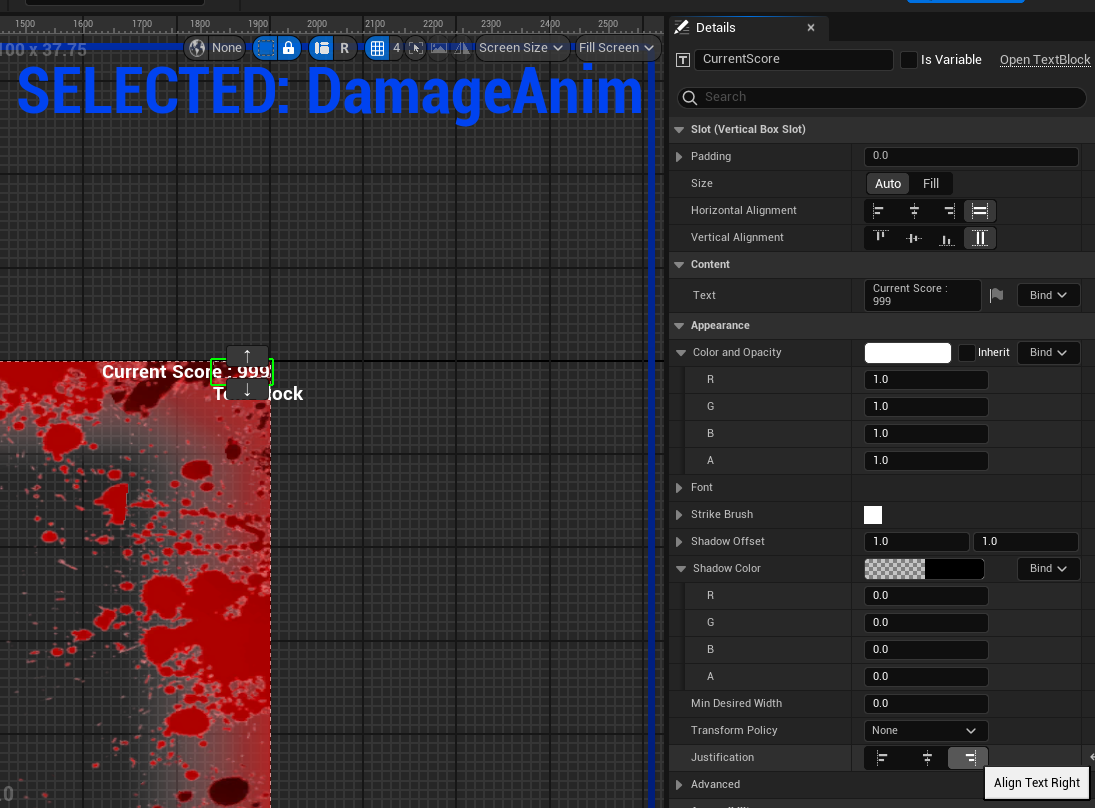 Text를 "Current Score : 999"로 설정했고 Justification을 우측으로 두었다.